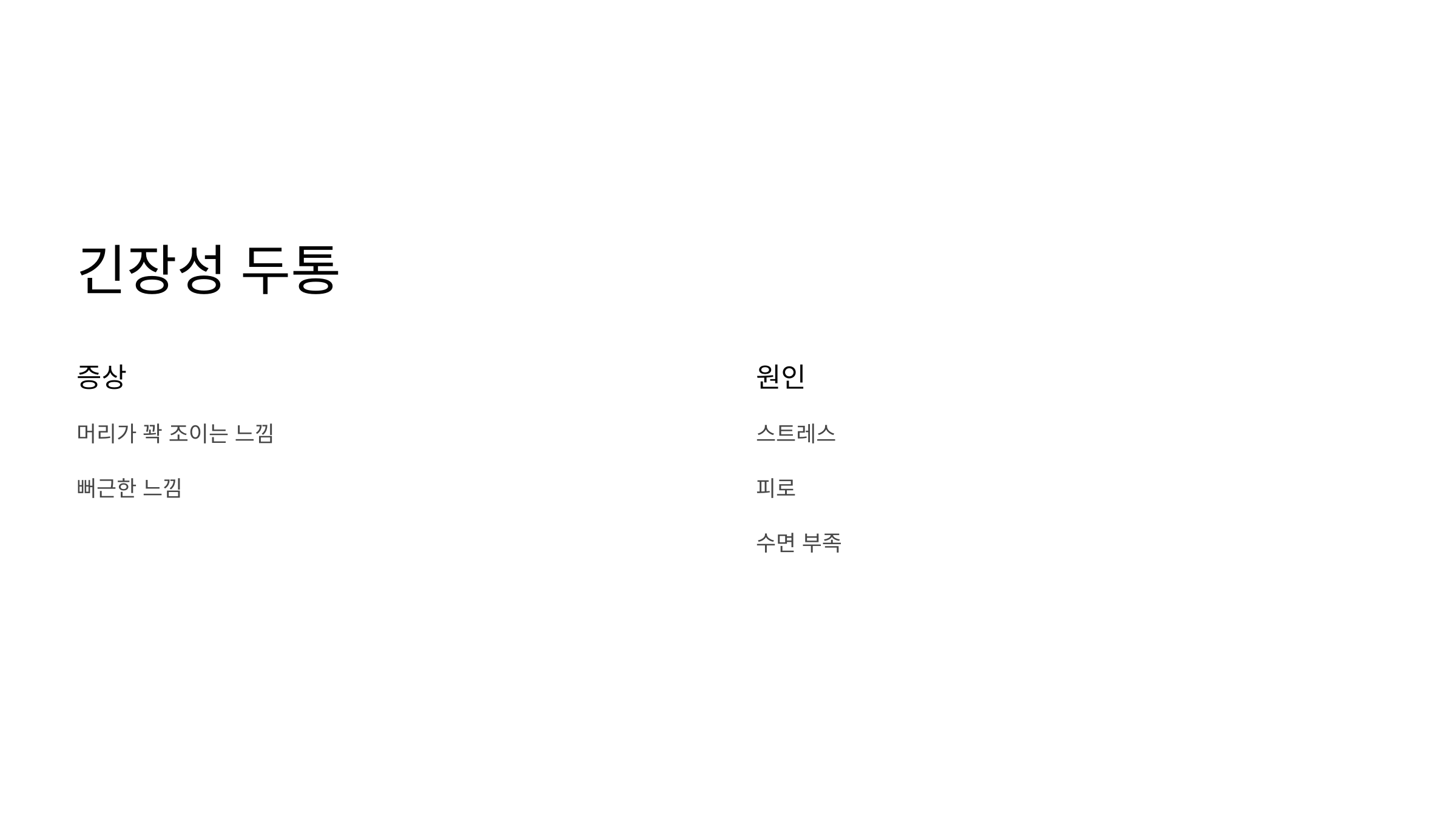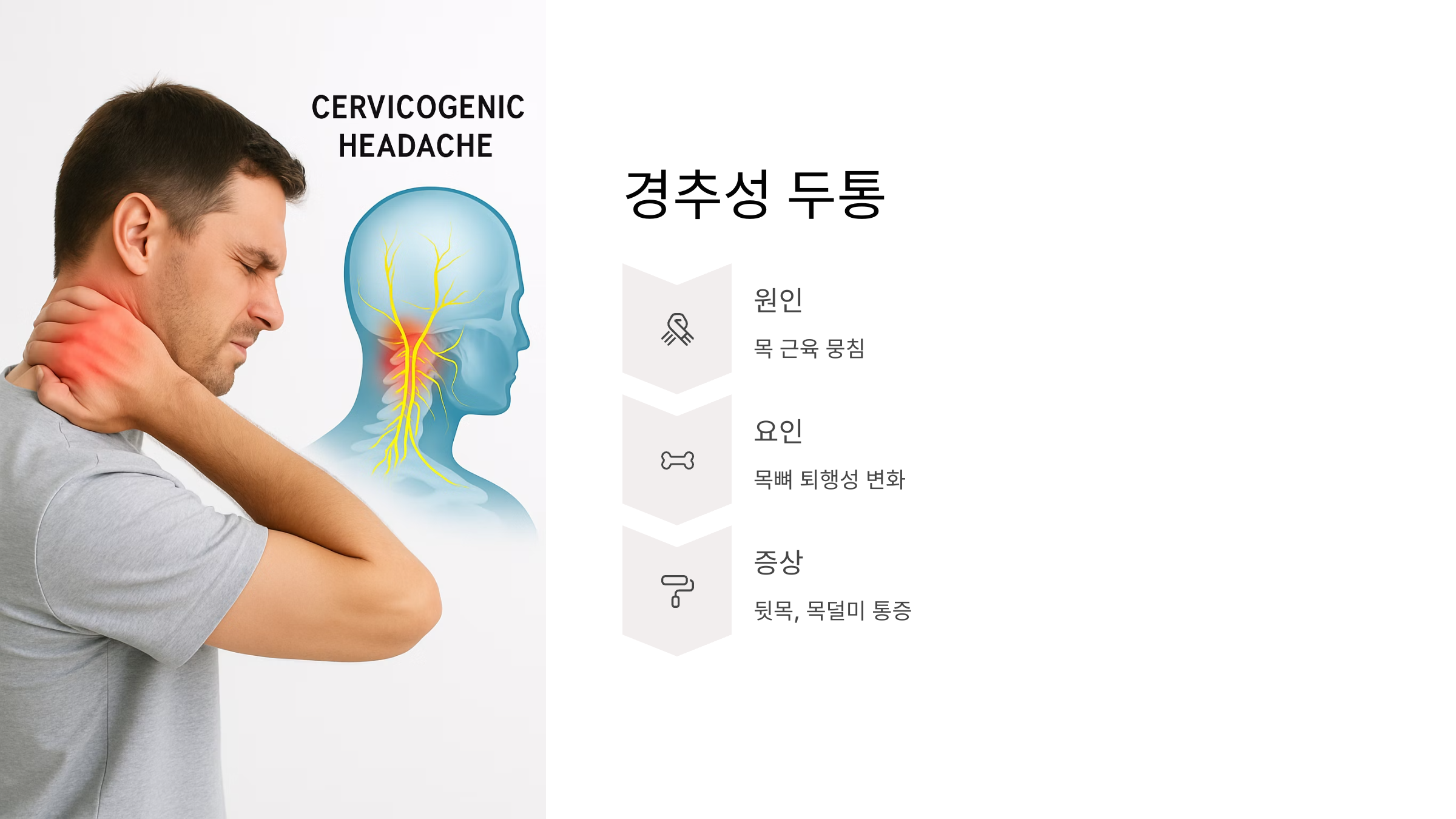 눈 주위나 관자놀이가 콕콕 쑤시고, 눈물, 콧물까지 쏟아질 수 있어요. 남성분들에게 더 많고, 너무 아파서 ‘자살 두통’이라고 불리기도 할 만큼 고통스럽대요. 경추성 두통은 목 문제 때문에 생기는 두통인데요. 목 근육이 뭉치거나, 목뼈가 퇴행성 변화를 겪으면서 생겨요.