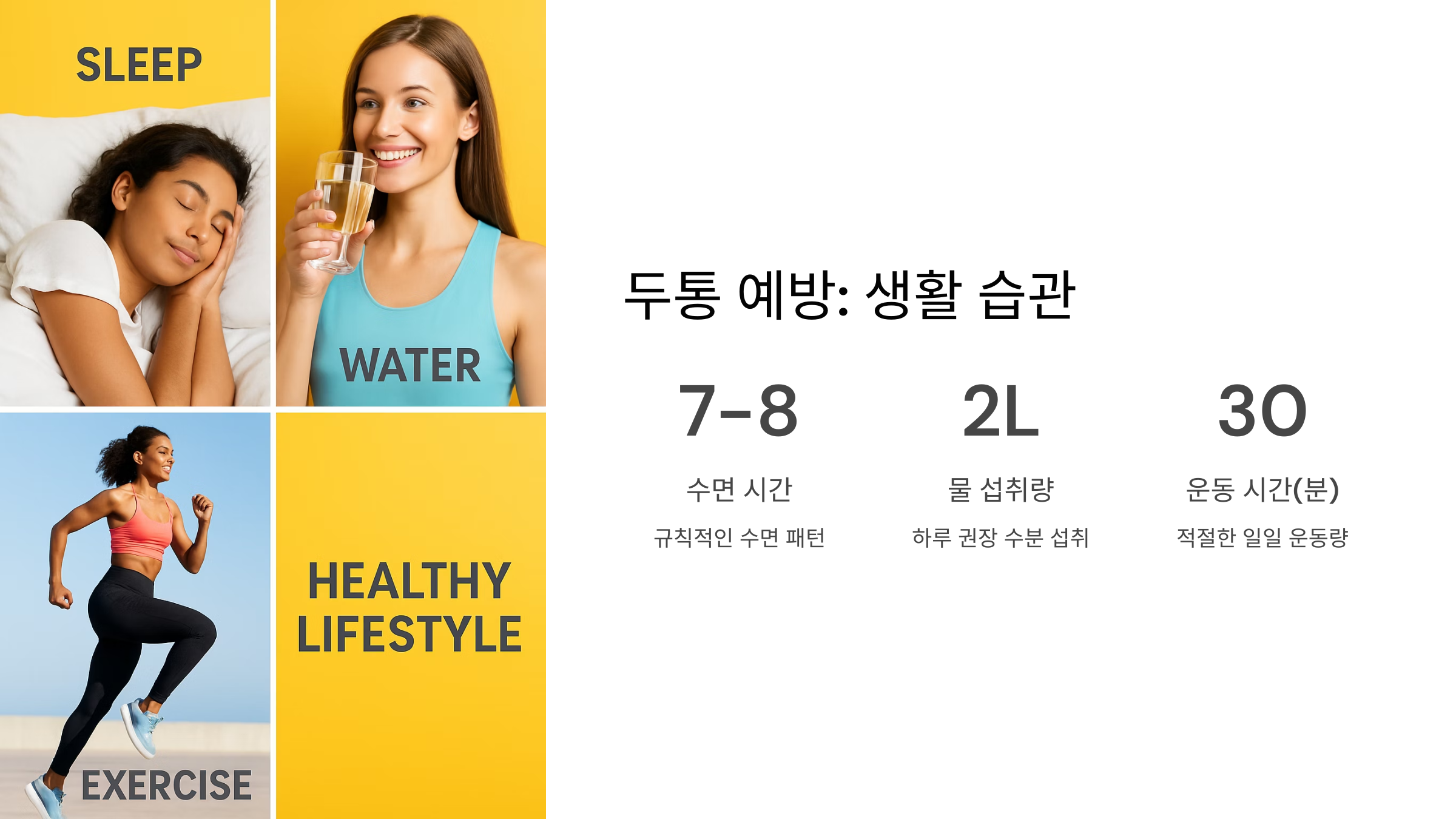 두통을 예방하는 가장 좋은 방법은 바로 건강한 생활 습관을 유지하는 거예요. 규칙적인 수면, 식사, 운동은 정말 중요해요. 스트레스 관리도 필수고요. 명상이나 요가, 즐거운 취미 활동 등으로 스트레스를 해소해 보세요.