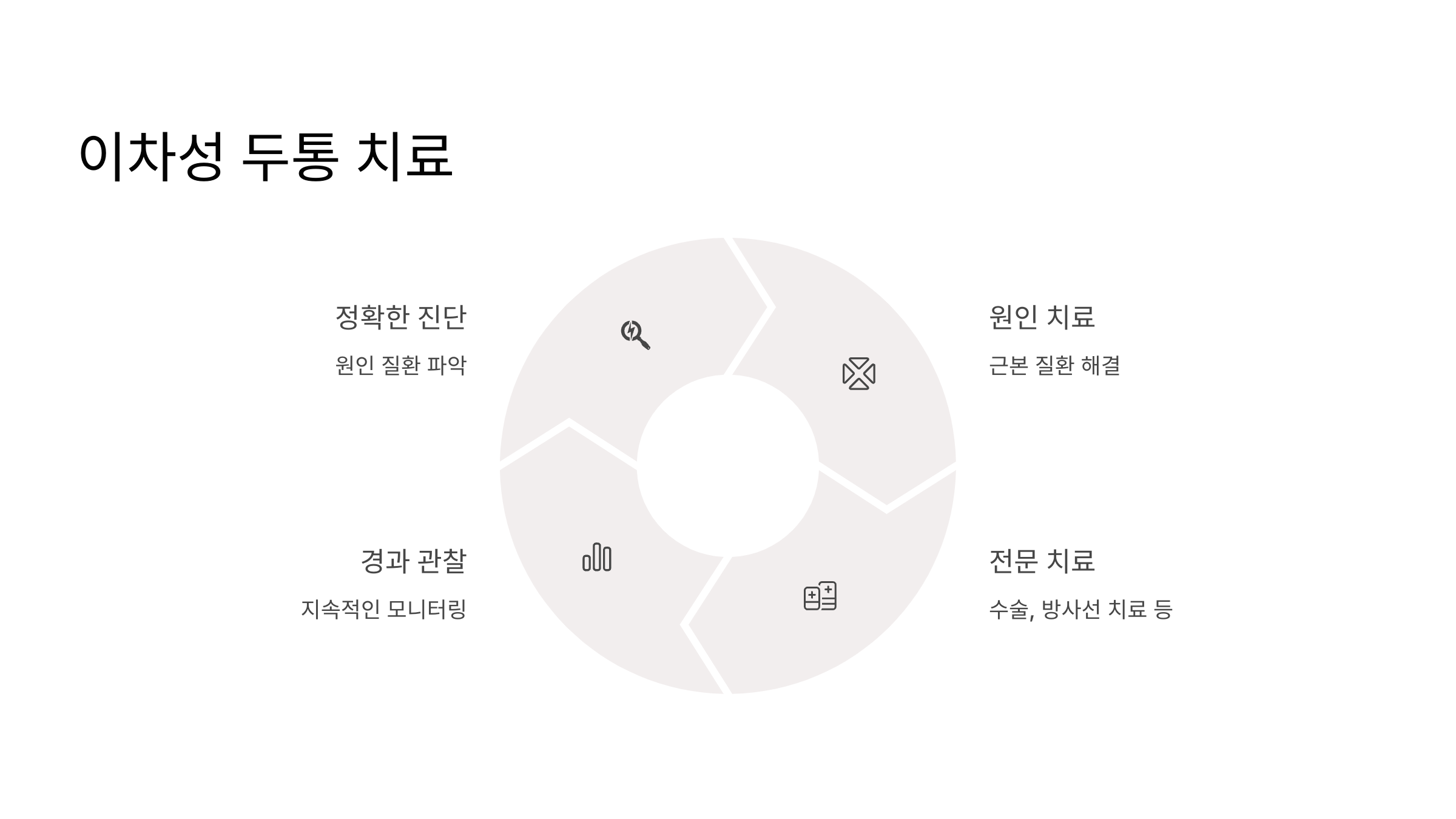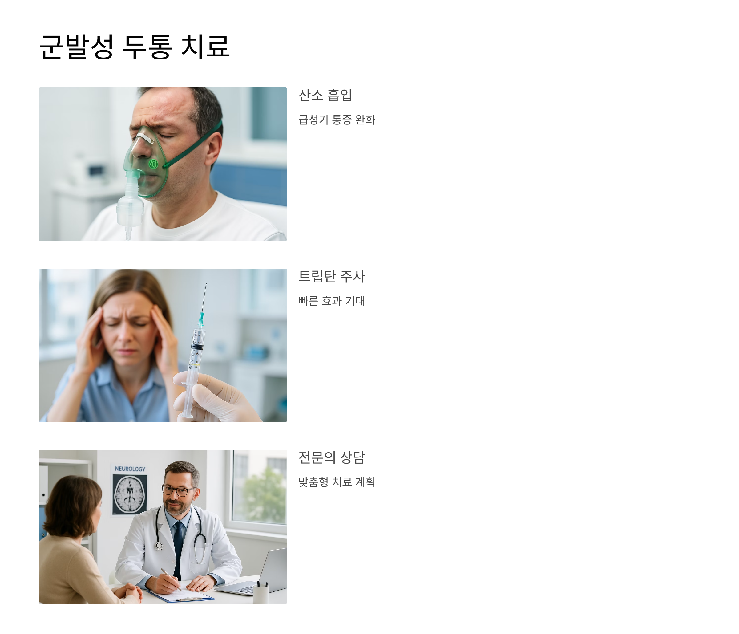 군발성 두통은 정말 힘들지만, 산소 흡입이나 트립탄 주사가 효과적일 수 있어요. 경추성 두통은 목의 문제를 해결하는 게 중요해요. 물리치료, 도수치료, 운동 치료를 받고, 자세 교정도 중요하죠. 이차성 두통은 원인 질환을 치료해야 하니까, 뇌종양이라면 수술이나 방사선 치료를 받아야 할 수도 있어요.