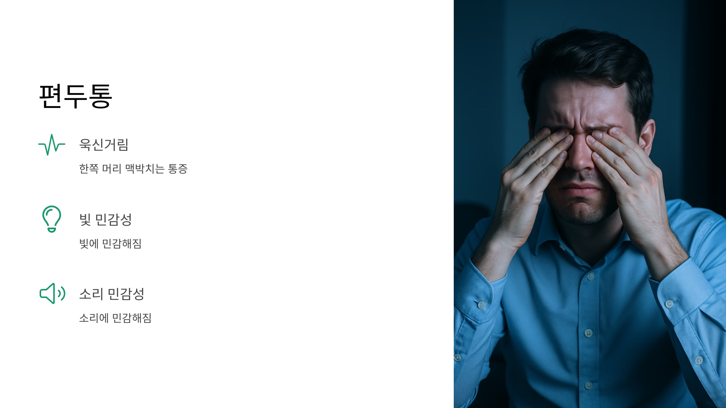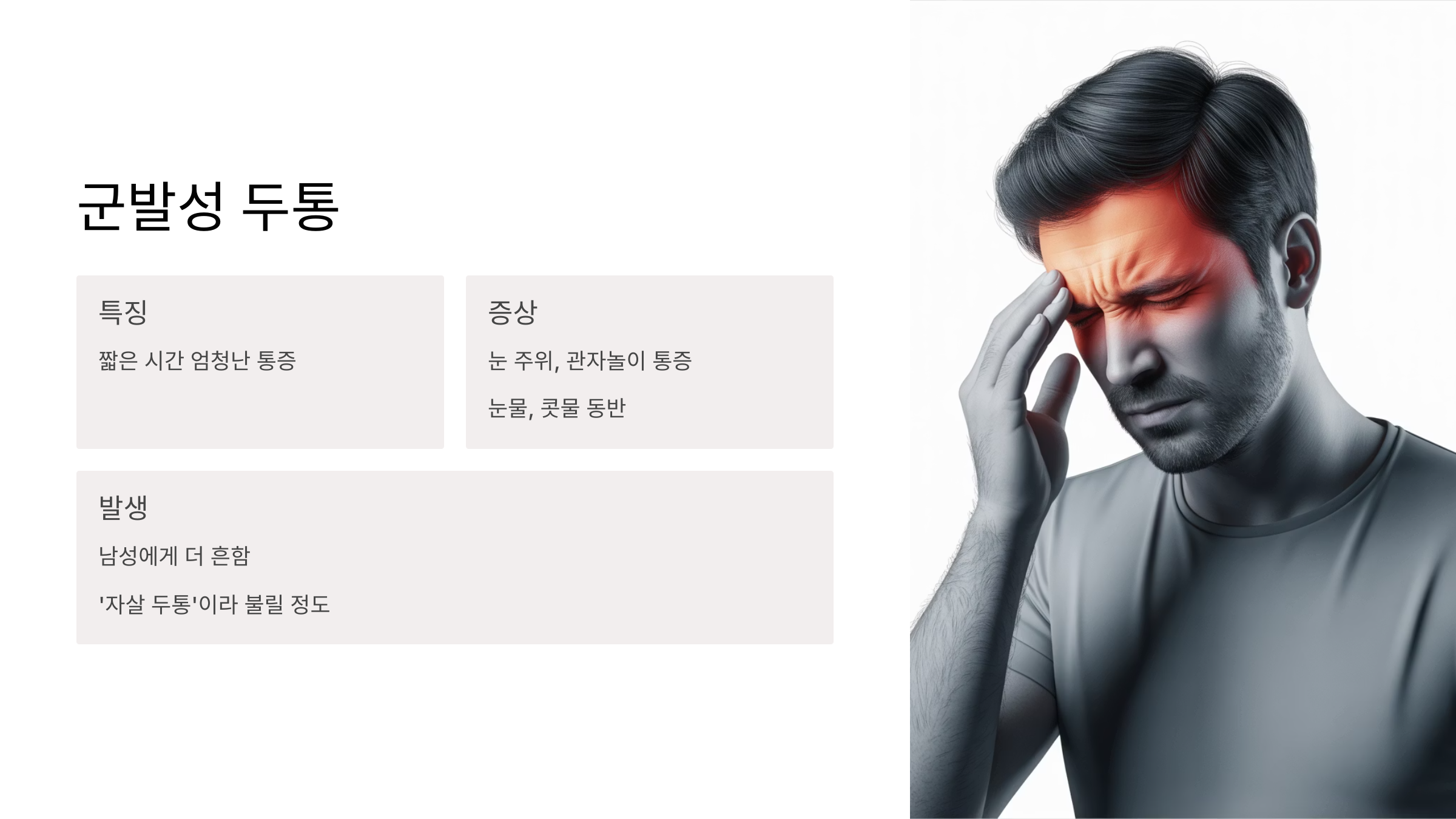 심하지 않은 경우가 많지만, 만성화되면 정말 괴로워요. 편두통은 한쪽 머리가 욱신거리고 쿵쿵 맥박 치는 듯한 심한 통증이 특징이에요. 심하면 토할 것 같고, 빛이나 소리에 민감해지기도 하죠. 여성분들에게 더 흔하게 나타나요. 군발성 두통은… 이름처럼 짧은 시간 동안 엄청나게 심한 통증이 몰려오는 거예요.