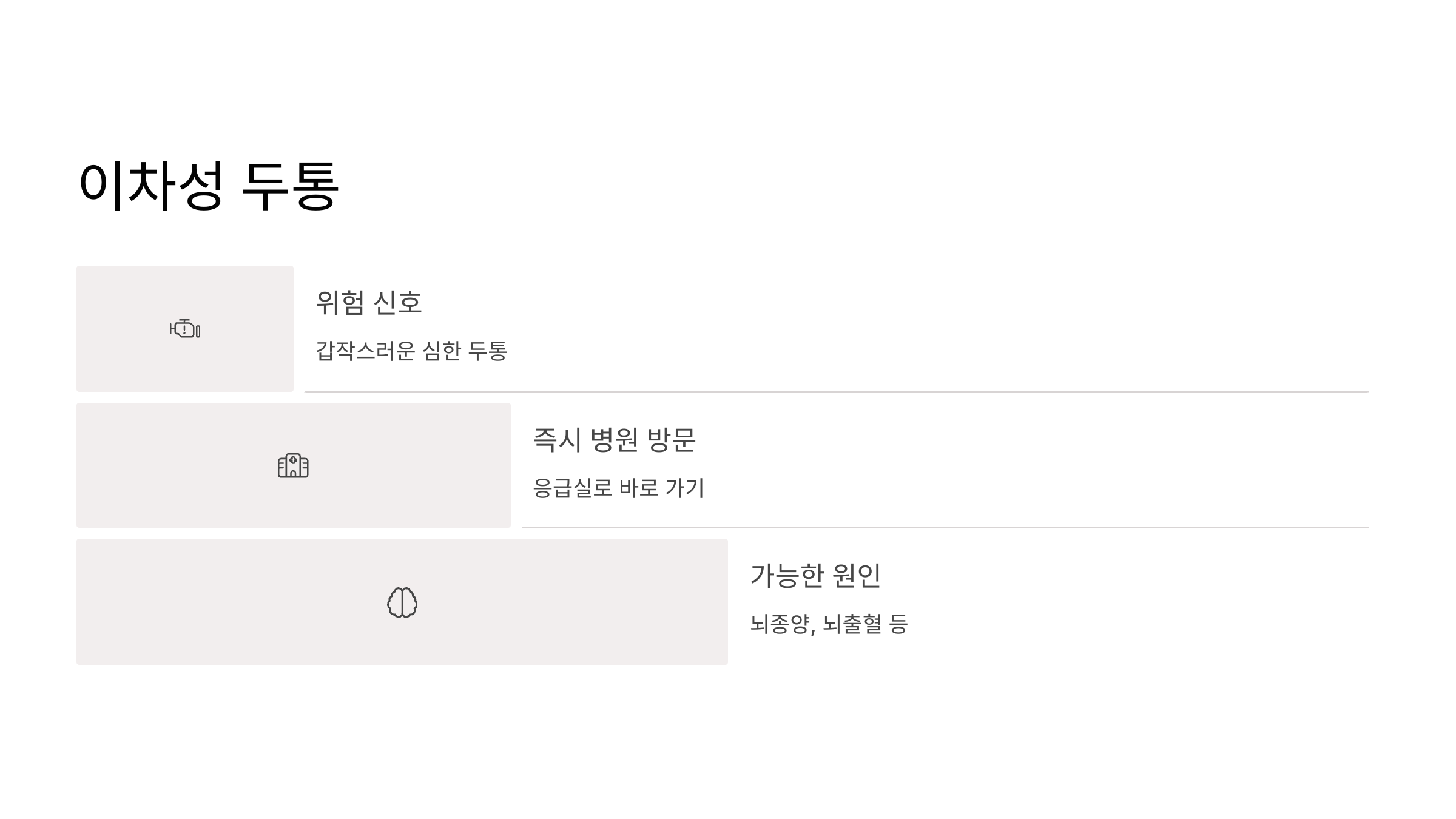 뇌졸중이나 뇌출혈일 가능성이 있으니까요. 그리고 아이들의 두통은 소아청소년과에서 진료받는 게 좋아요. 어른과는 원인과 증상이 다를 수 있거든요. 여러분의 두통 병원 어디로 가야할 지 유형에 맞는 병원을 찾으셨나요? 다음 단계로 넘어가 볼게요.