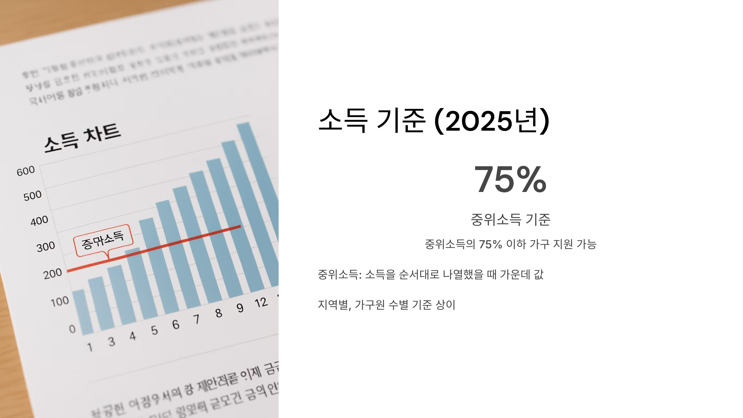 자, 이제 가장 중요한 소득과 재산 기준을 자세하게 살펴볼게요. 2025년 기준으로 소득은 중위소득의 75% 이하인 경우 지원을 받을 수 있답니다. 중위소득이 뭔지 모르시겠다고요? 간단히 말해, 소득을 순서대로 나열했을 때 가운데 있는 소득을 말하는데요.