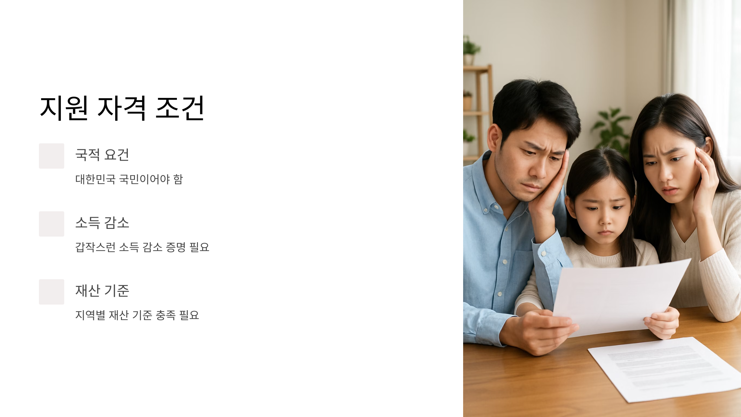 단순히 소득이 적은 것만으로는 안 되고, 소득이 줄어든 이유를 확실하게 보여주는 서류가 필요해요. 그리고 재산도 기준이 있어요. 집이나 땅, 예금 등 재산이 너무 많으면 지원을 받을 수 없을 수도 있어요.