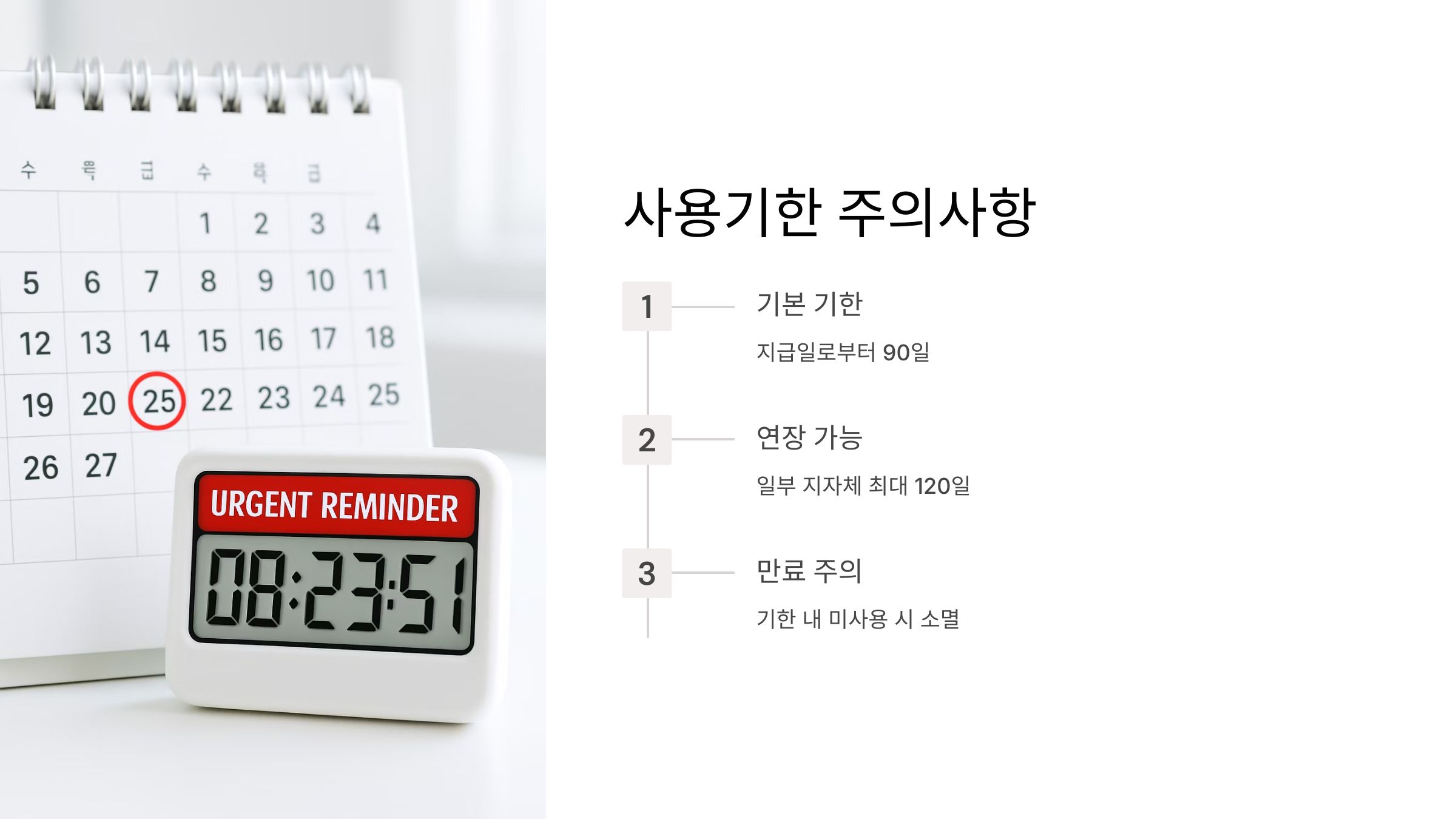 마지막으로, 가장 중요한 사용기한입니다! 기본적으로 지급일로부터 90일이지만, 일부 지자체에서는 최대 120일까지 연장 적용하기도 합니다. 따라서, 여러분이 지원금을 받은 날짜부터 꼼꼼하게 사용기한을 계산하고, 기한 내에 사용해야 소중한 혜택을 놓치지 않습니다.