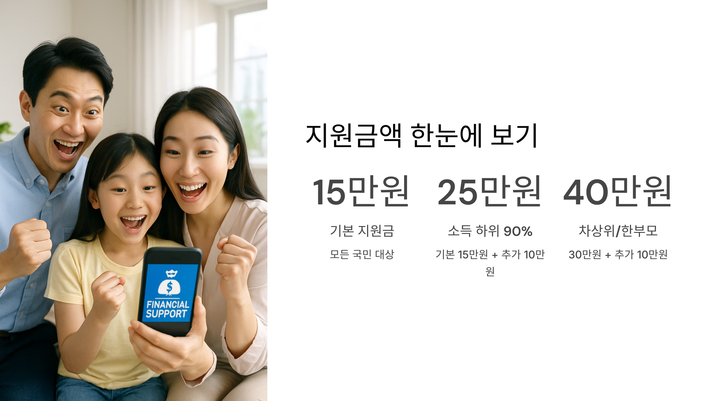 자, 이제 여러분이 받을 수 있는 지원금액을 계산해 볼 차례입니다! 우선, 모든 국민에게 기본적으로 15만 원이 지급된다는 사실! 잊지 마세요. 하지만 여기서 끝이 아니죠? 소득 하위 90%에 속한다면, 추가로 10만 원을 더 받을 수 있어요!