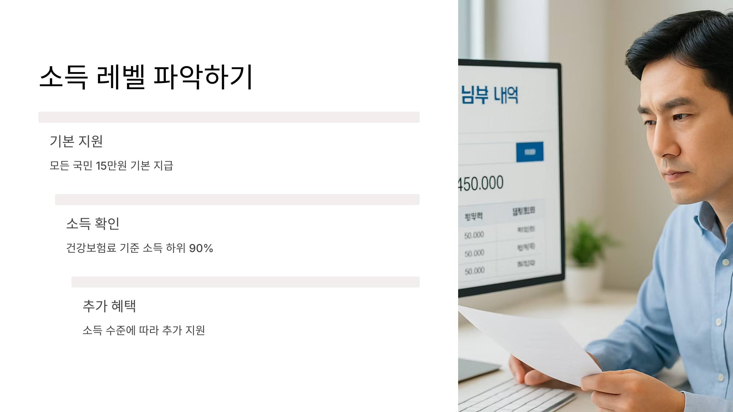 마치 보물찾기처럼, 내가 얼마나 받을 수 있을지 확인하는 과정부터 설레지 않나요? 자, 이제 여러분의 '소비쿠폰 보물지도'를 만들어 볼까요? 우선, 첫 번째 단계는 바로 여러분의 '소득 레벨'을 파악하는 거예요. 소득이 높은 분이든 낮은 분이든, 누구나 기본 15만 원을 받지만, 추가 혜택은 소득 수준에 따라 달라져요.