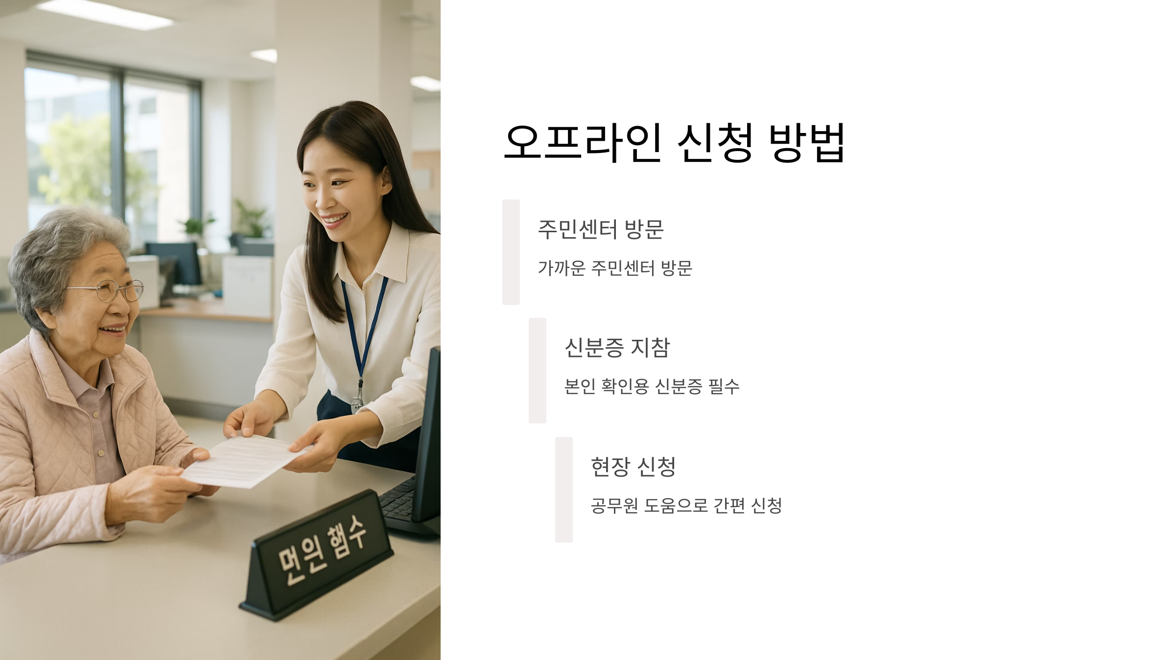 주민센터를 방문해서 오프라인으로 신청할 수도 있습니다. 디지털 사용이 어려운 어르신이나 장애인 분들을 위해 현장에서 친절한 공무원분들이 도와드립니다. 신분증만 챙겨서 가면 끝! 어렵지 않죠?