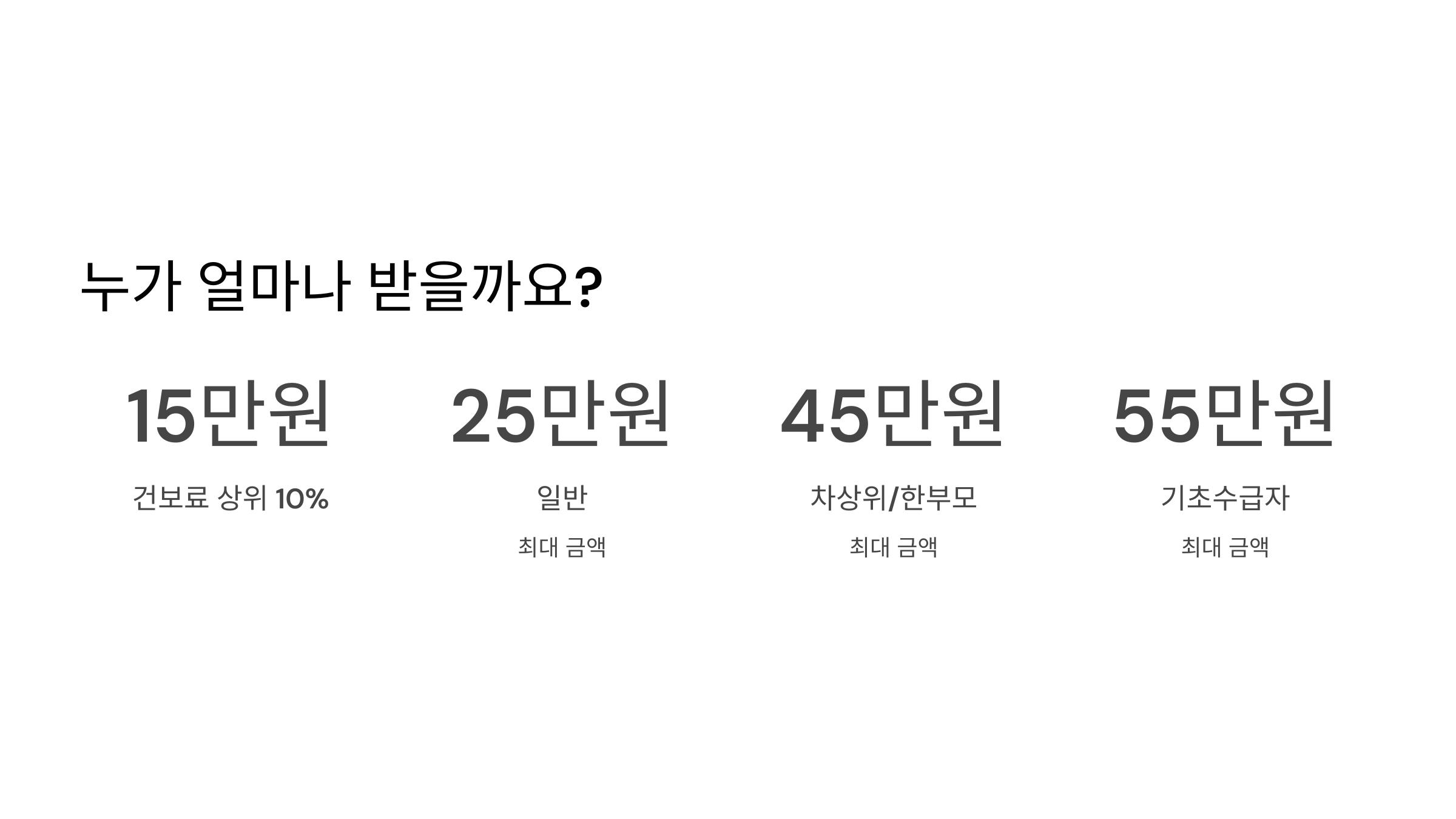 내가 받을 수 있는 금액은 얼마일까 궁금하시죠? 건강보험료 기준으로 금액이 달라져요. 건보료 상위 10%는 1차로 15만 원, 일반은 15만 원부터 최대 25만 원까지, 차상위/한부모는 30만 원부터 최대 45만 원, 기초수급자는 40만 원부터 최대 55만 원까지 받을 수 있답니다!