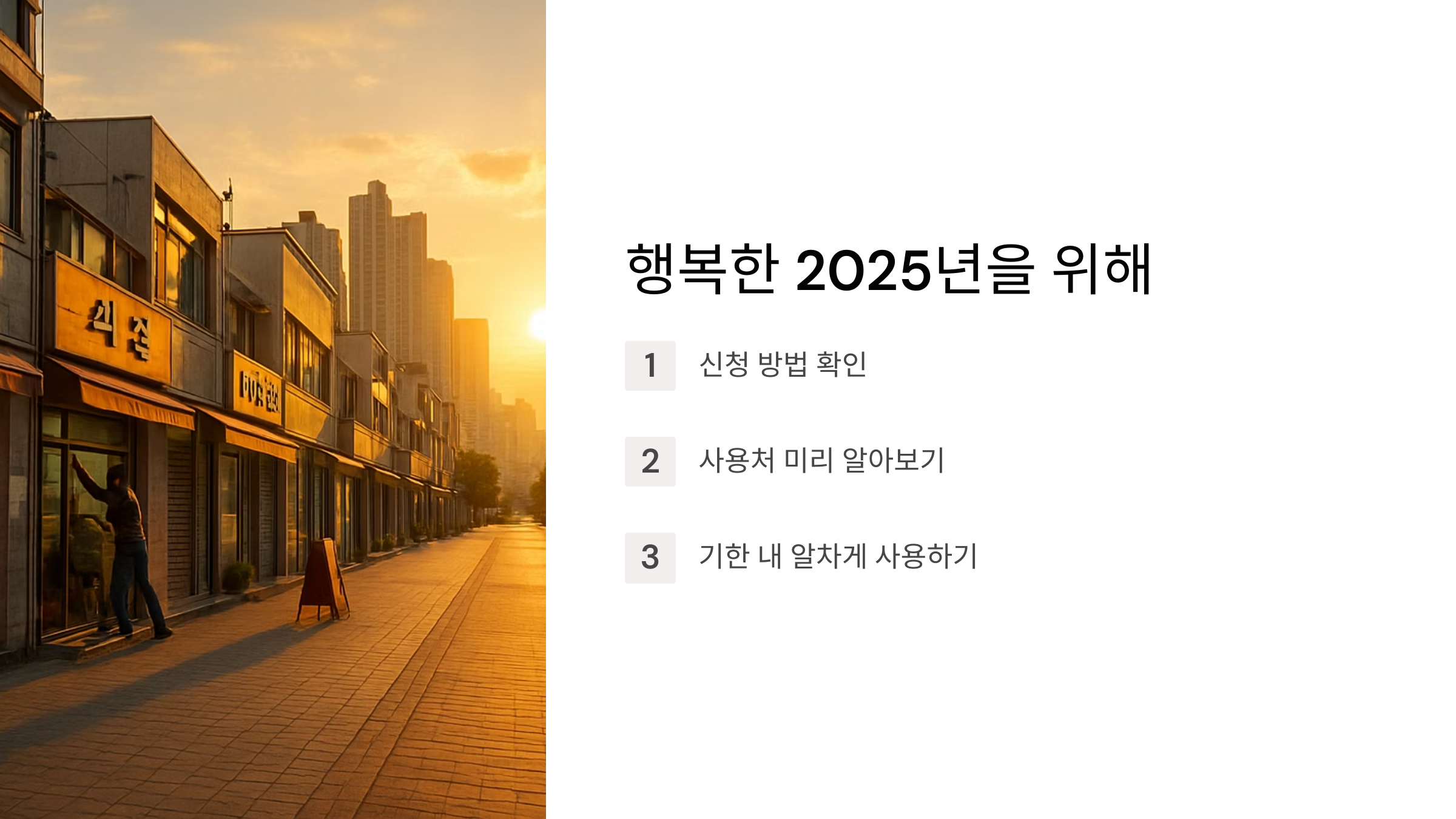 마무리하며, 2025년 민생회복 소비쿠폰은 단순한 지원금이 아니라, 힘든 시기를 함께 극복하고, 경제 활성화에 기여하는 정책입니다. 소중한 기회를 놓치지 말고, 신청 방법과 사용처를 잘 확인하셔서 알차게 사용하시길 바랍니다. 모두가 행복한 2025년이 되기를 응원합니다!