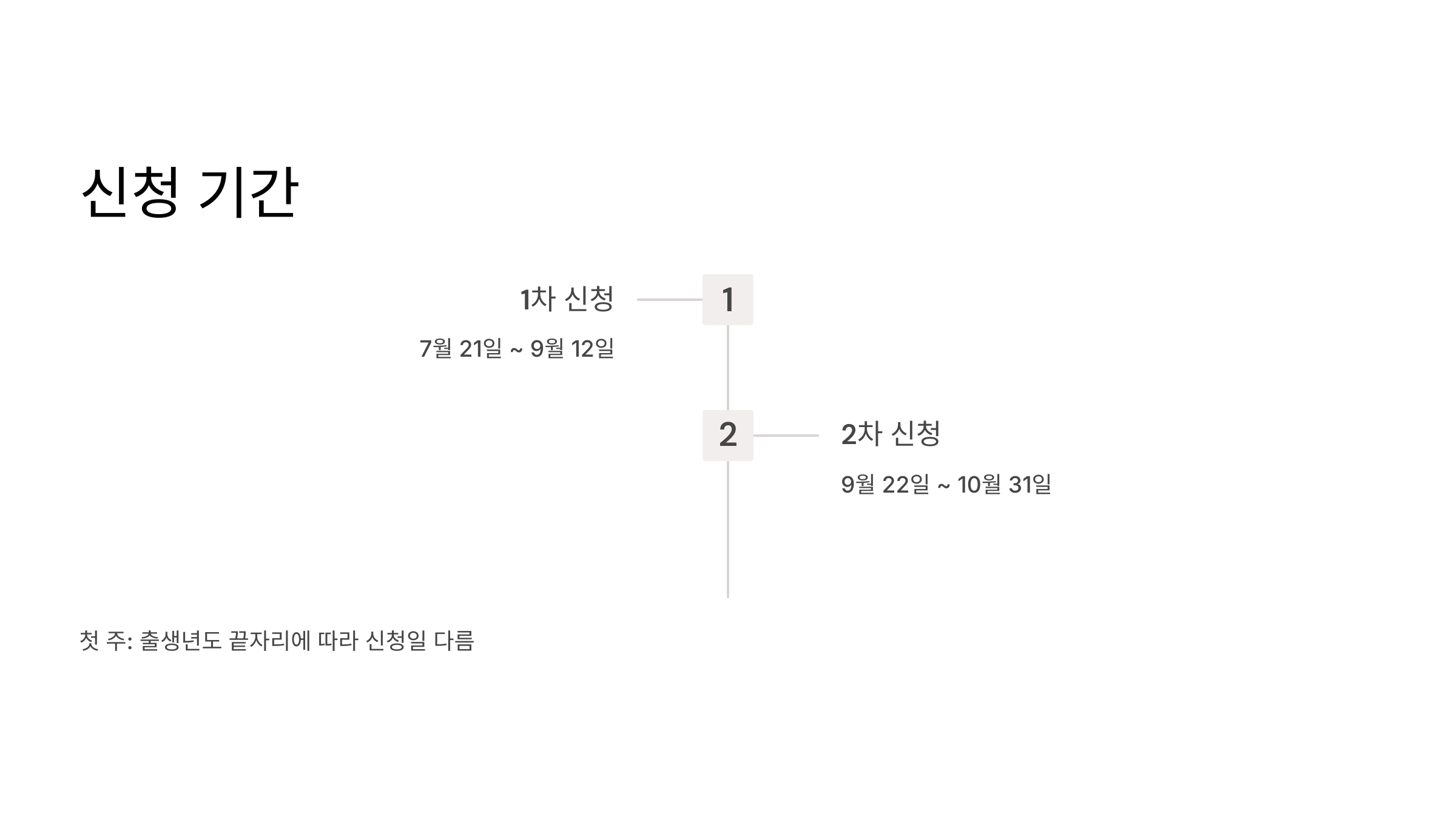 자, 이제 쿠폰을 어떻게 신청하는지 알아볼까요? 우선 신청 기간을 꼭 기억해야 해요. 1차 신청은 7월 21일부터 9월 12일까지, 2차 신청은 9월 22일부터 10월 31일까지랍니다. 첫 주에는 출생 연도 끝자리에 따라 신청 요일이 정해져 있으니 꼭 확인하세요.