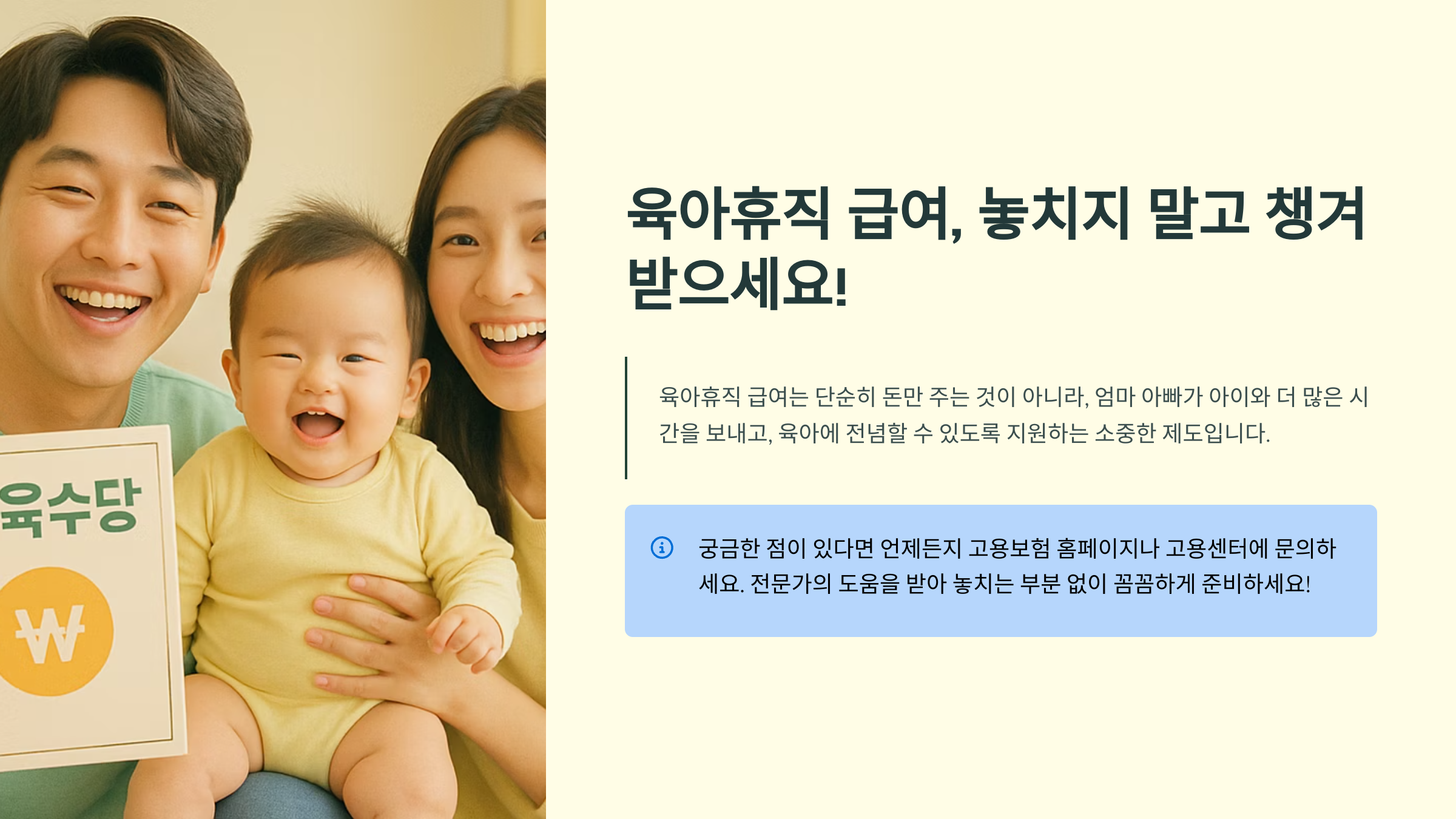 육아휴직 급여는 단순히 돈만 주는 것이 아니라, 엄마 아빠가 아이와 더 많은 시간을 보내고, 육아에 전념할 수 있도록 지원하는 소중한 제도입니다. 아이와 함께하는 시간, 그 어떤 것과도 바꿀 수 없는 귀한 시간이죠.