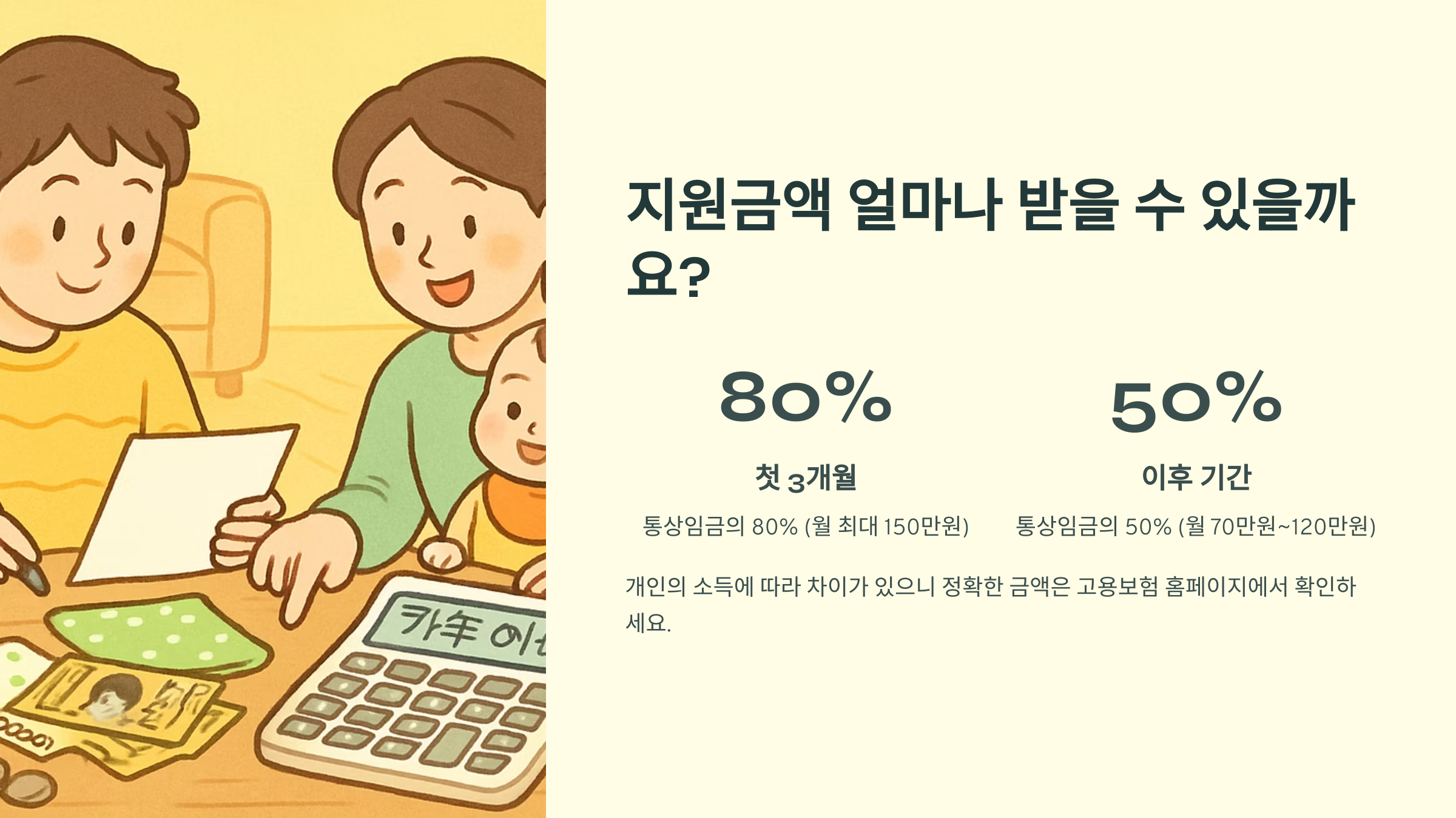 얼마나 받을 수 있느냐고요? 궁금하시죠? 첫 3개월은 통상임금의 80%를 받을 수 있어요. 상한액은 월 150만 원입니다. 그리고 그 이후에는 50%를 받게 되는데, 월 120만 원이 상한이고, 70만 원이 하한이에요. 상황에 따라 다를 수 있으니 정확한 금액은 고용보험 홈페이지에서 확인하는 것이 좋습니다.
