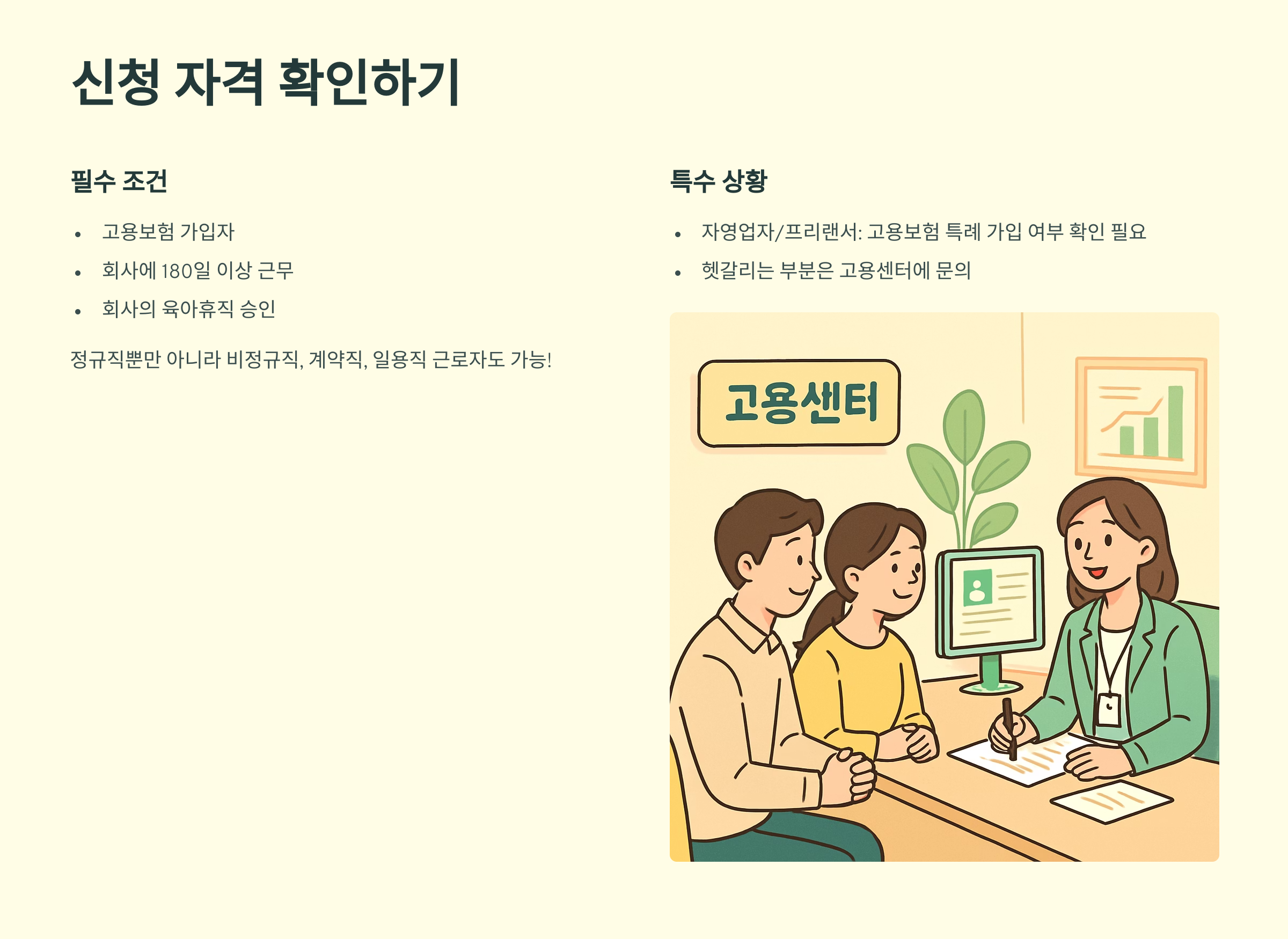 정규직만 가능하다고 생각하면 큰 오산이에요. 비정규직, 계약직, 심지어 일용직 근로자분들도 가능하답니다. 물론, 회사의 육아휴직 승인은 필수에요. 회사에 미리 이야기하고 승인을 받는 것이 중요하겠죠? 자영업자나 프리랜서분들은 고용보험 특례 가입 여부를 확인하셔야 해요.