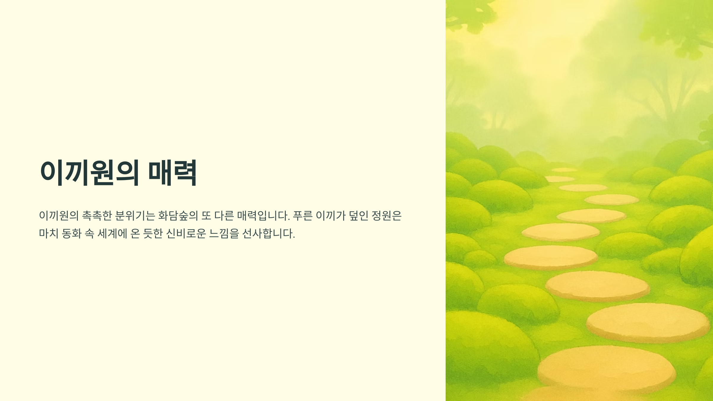저는 개인적으로 이끼원의 촉촉한 분위기가 너무 좋았어요. 봄에는 수선화와 튤립, 여름에는 싱그러운 녹음, 가을에는 단풍의 향연, 겨울에는 설경까지, 계절마다 다른 매력을 뽐내는 화담숲! 놓치지 마세요!