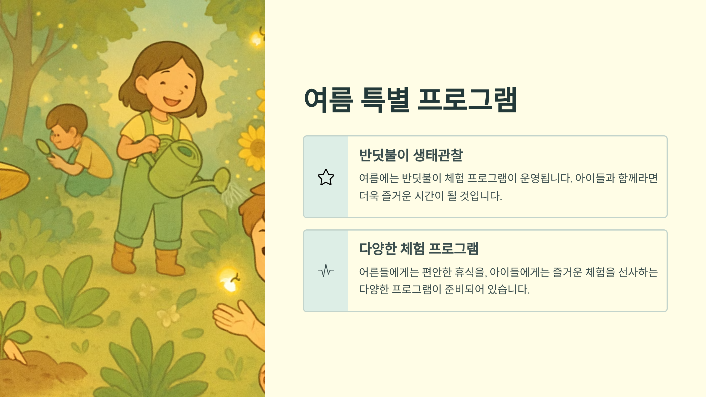 곳곳에 아기자기한 포토존도 많으니 예쁜 사진도 잔뜩 건져갈 수 있어요. 특히 아이들과 함께라면 반딧불이 생태관찰이나 다양한 체험 프로그램도 참여해 보시는 걸 추천드려요. 어른들에게는 편안한 휴식을, 아이들에게는 즐거운 체험을 선사하는 곳이죠.