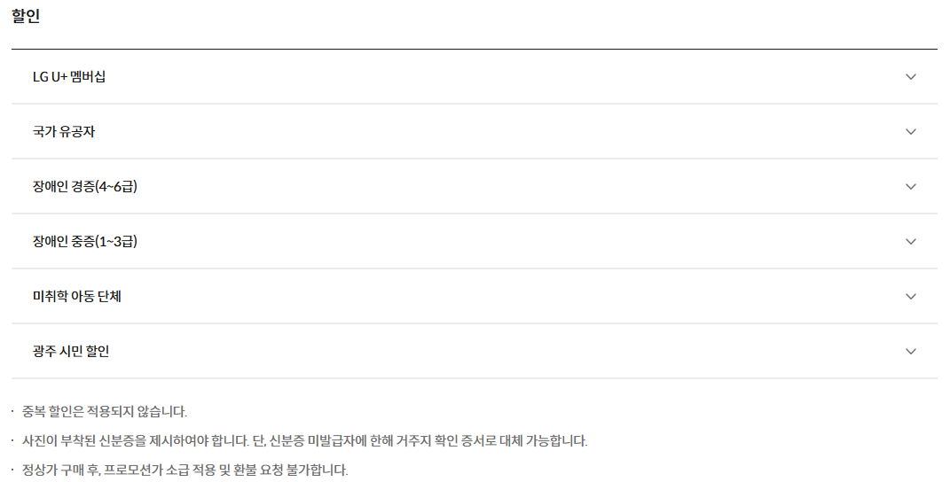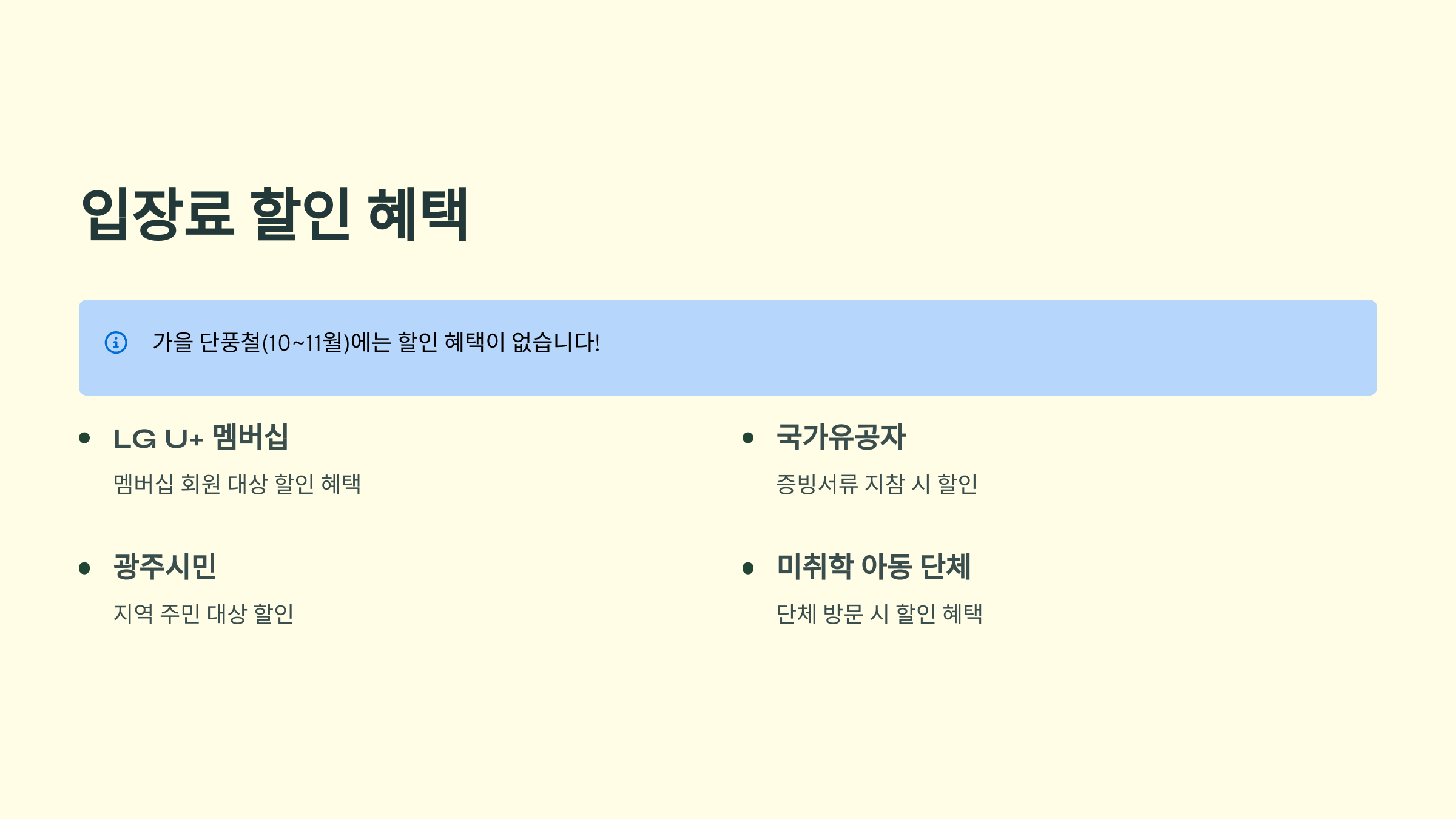 단, 가을 단풍철(10~11월)에는 할인 혜택이 없다는 점 꼭 기억해 주세요! 그리고 LG U+ 멤버십이나 국가유공자, 광주시민, 미취학 아동 단체 등 다양한 할인 혜택이 있으니 미리 확인해서 알뜰하게 이용하시면 좋을 것 같아요.
