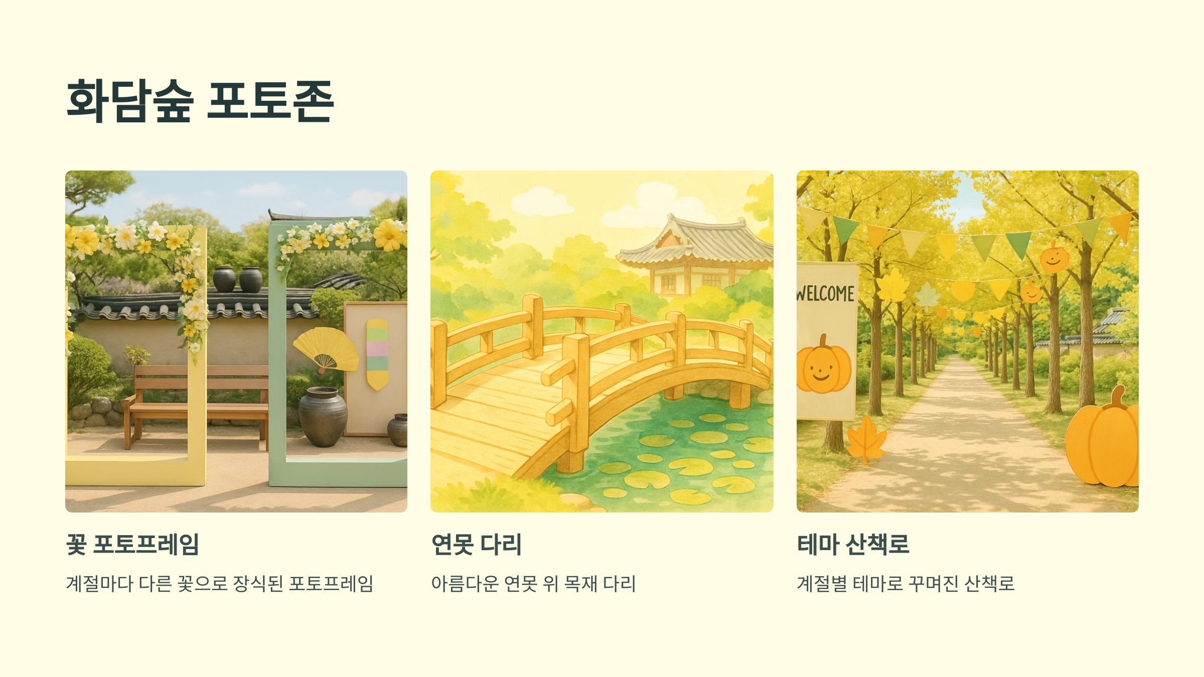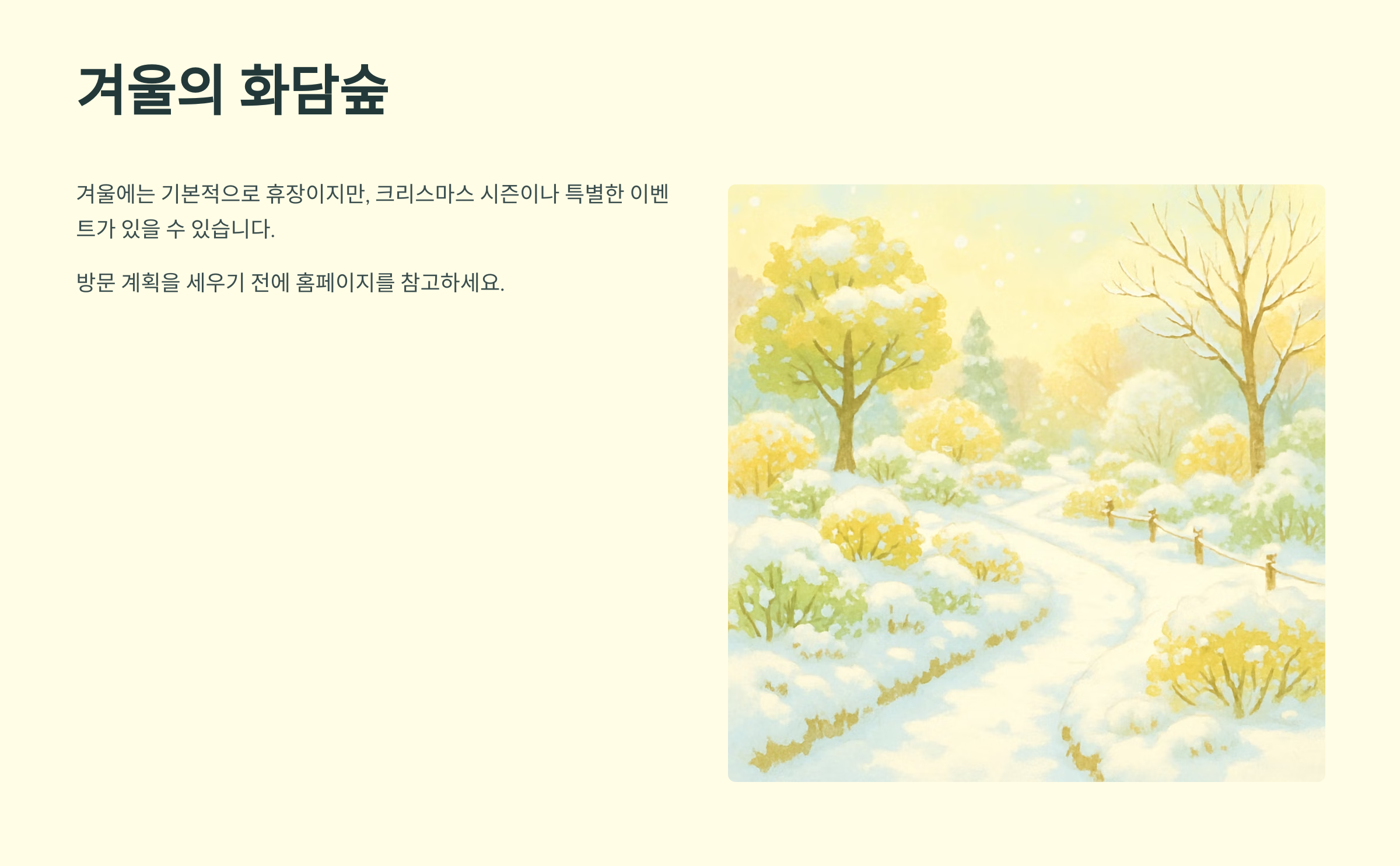 겨울에는 휴장이지만, 크리스마스 시즌이나 특별한 이벤트가 있을 수 있으니 홈페이지를 참고해서 방문 계획을 세우세요. 계절마다 다른 매력을 가진 화담숲에서 잊지 못할 추억을 만들어보세요! 각 계절마다 놓치면 아쉬울 포토존이 많으니 카메라 충전은 필수!