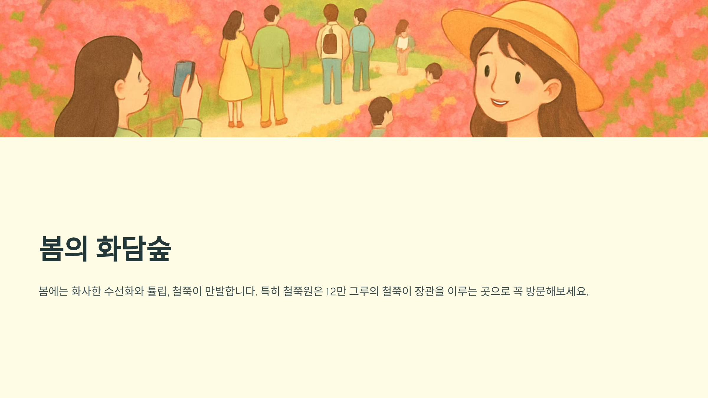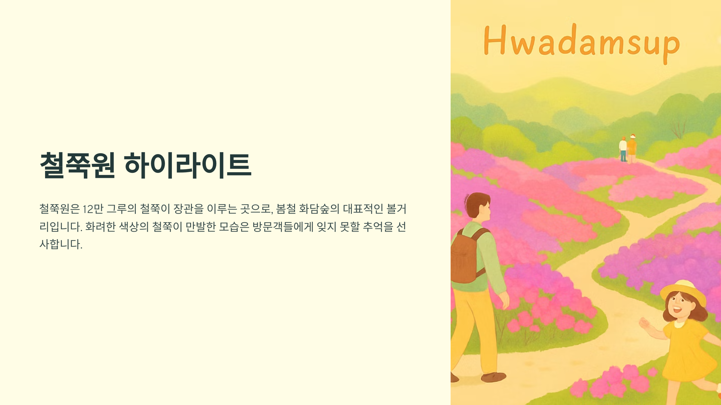 화담숲은 사계절 내내 아름다운 풍경을 선사해요. 봄에는 화사한 수선화와 튤립, 철쭉이 만발하고, 여름에는 싱그러운 녹음과 시원한 숲길이 기다리고 있습니다. 특히 철쭉원은 12만 그루의 철쭉이 장관을 이루는 곳이니 꼭 방문해 보세요.
