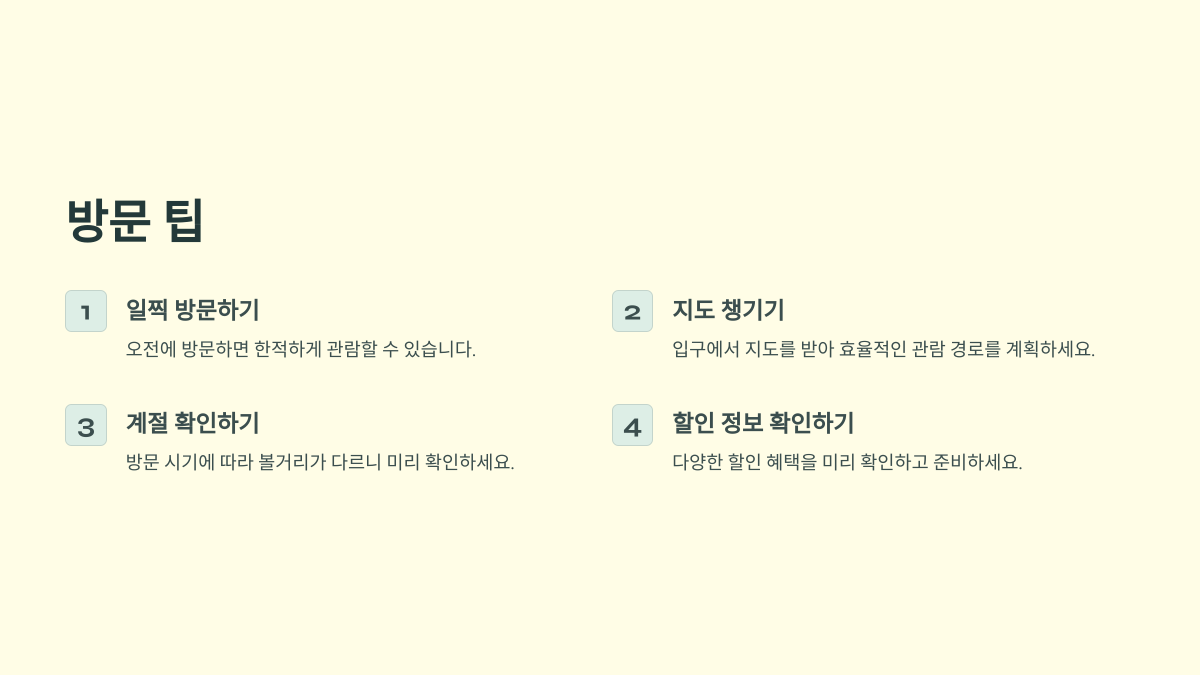 예약 방법은 공식 홈페이지를 통해 간편하게 진행할 수 있습니다. 홈페이지에서 원하는 날짜와 시간을 선택하고, 인원을 입력 후 결제하면 예약 완료! 예약 확인증은 꼭 출력하거나 휴대폰에 저장해 두세요. 입장 시 필요하답니다.