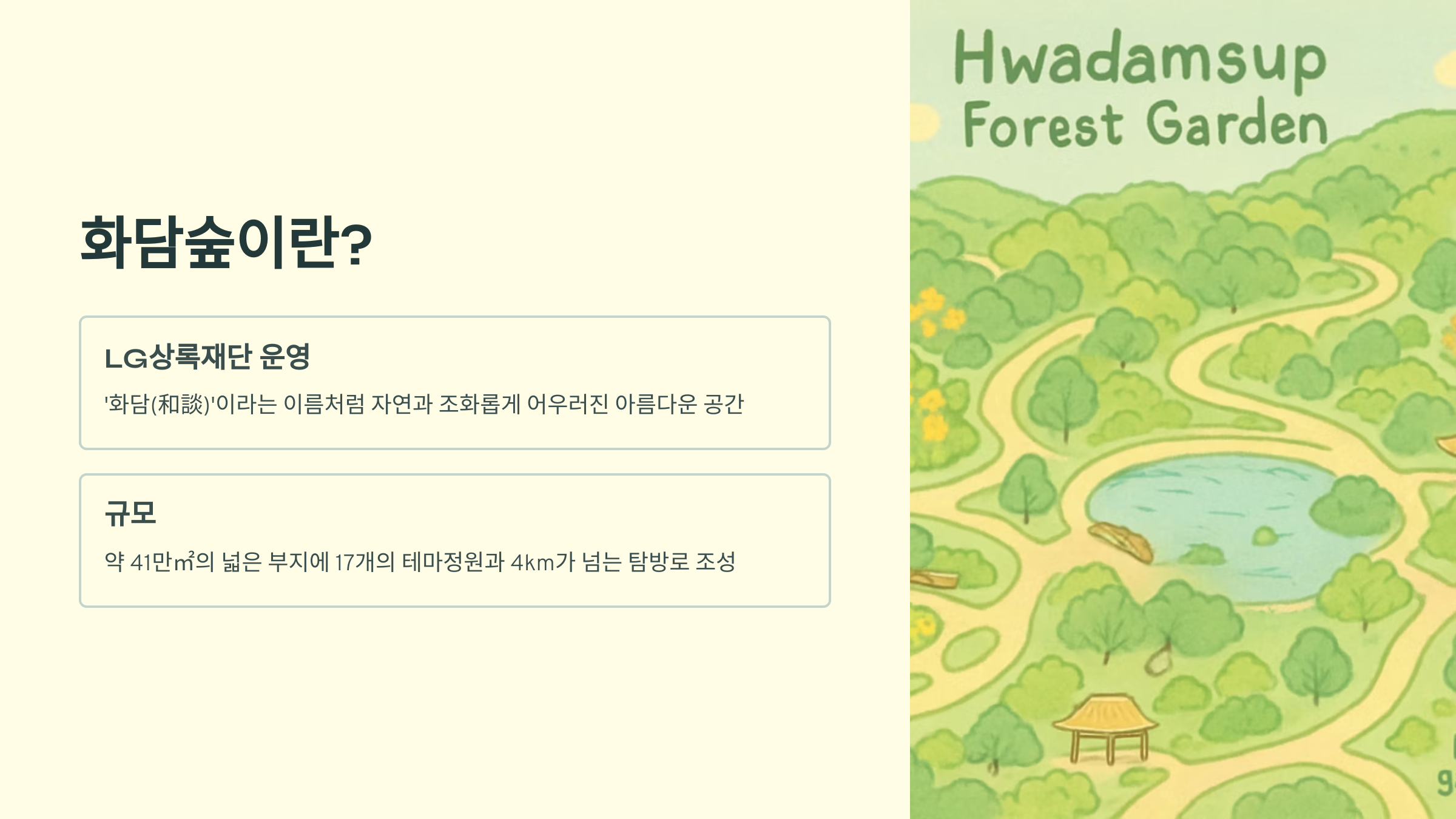 화담숲은 LG상록재단이 운영하는 곳이에요. '화담(和談)'이라는 이름처럼 자연과 조화롭게 어우러진 아름다운 공간이죠. 약 41만㎡의 넓은 부지에 17개의 테마정원과 4km가 넘는 탐방로가 조성되어 있어서 하루 종일 즐겁게 산책하며 다양한 식물들을 감상할 수 있답니다.