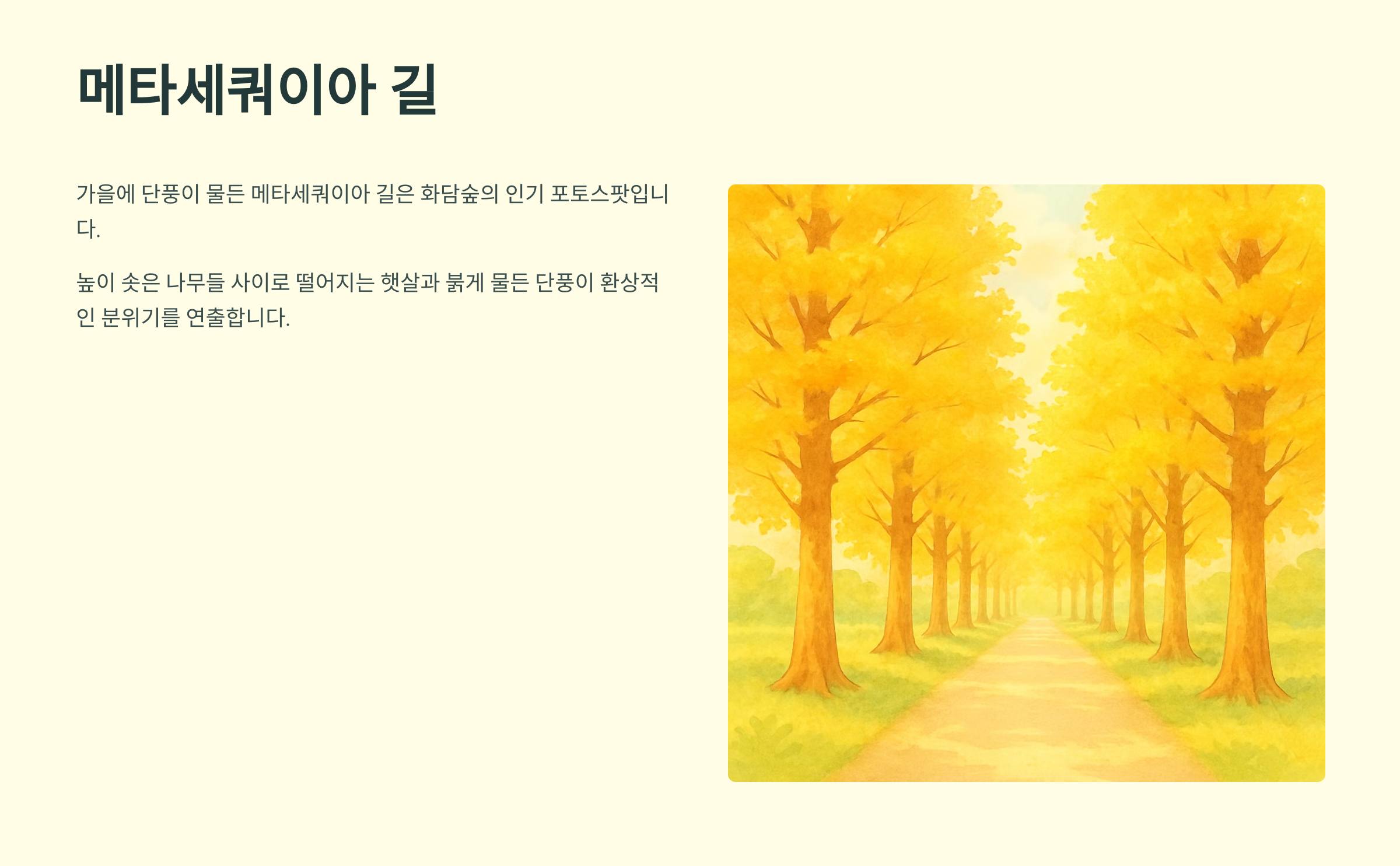 여름에는 반딧불이 체험 프로그램도 운영된다고 하니 아이들과 함께라면 더욱 즐거운 시간이 될 거 같네요! 가을에는 단풍이 절정을 이루는 곳이니 만추의 아름다움을 만끽할 수 있을 거예요. 단풍이 물든 메타세쿼이아 길은 사진 찍기에도 정말 예쁜 곳이랍니다.