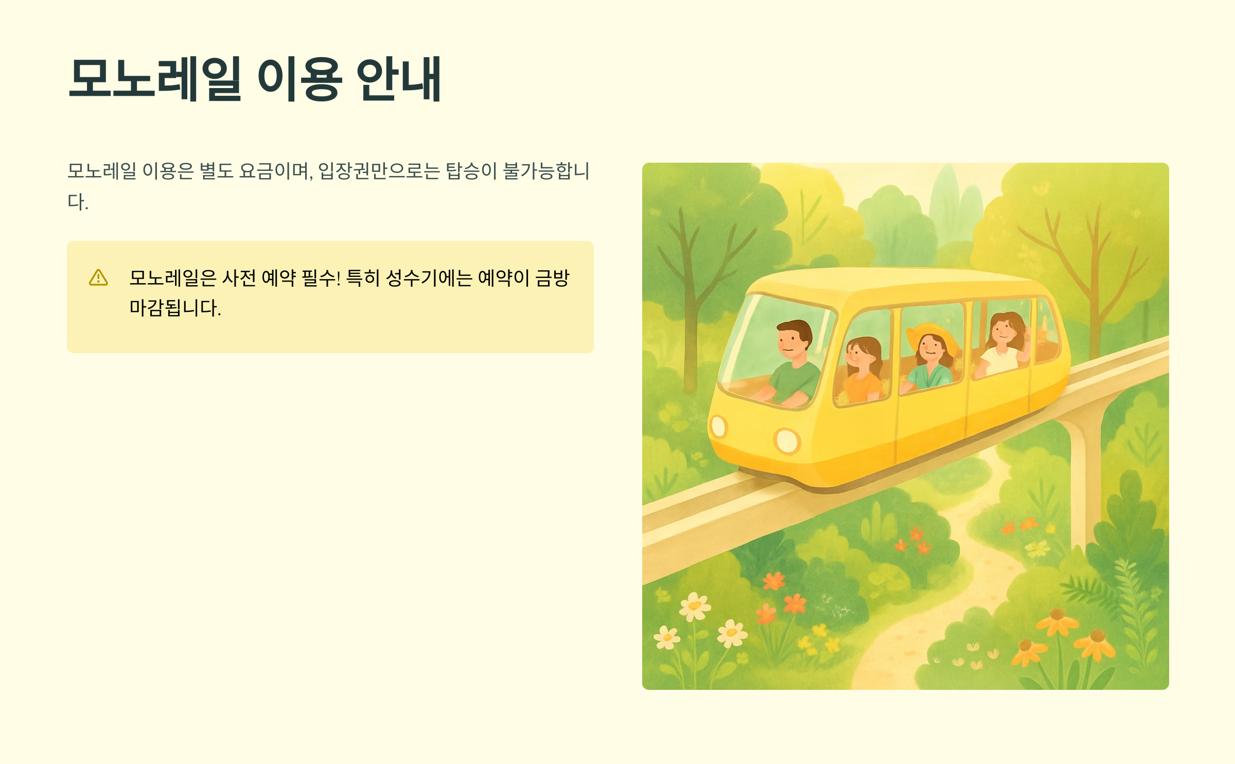 모노레일 이용은 별도 요금이고, 입장권만으로는 탑승이 불가능하니 참고하세요! 모노레일은 사전 예약 필수! 특히 성수기에는 예약이 금방 마감되니까 서두르는 게 좋아요.
