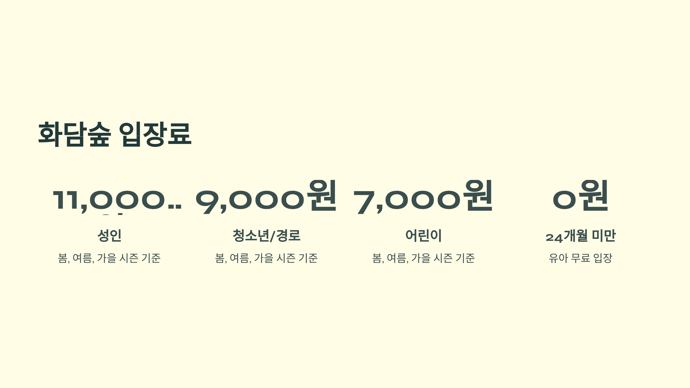 화담숲 입장료는 계절과 연령에 따라 조금씩 달라요. 봄, 여름, 가을 시즌에는 성인 11,000원, 청소년 9,000원, 어린이 7,000원이에요. 경로우대는 9,000원이고 24개월 미만 유아는 무료랍니다.