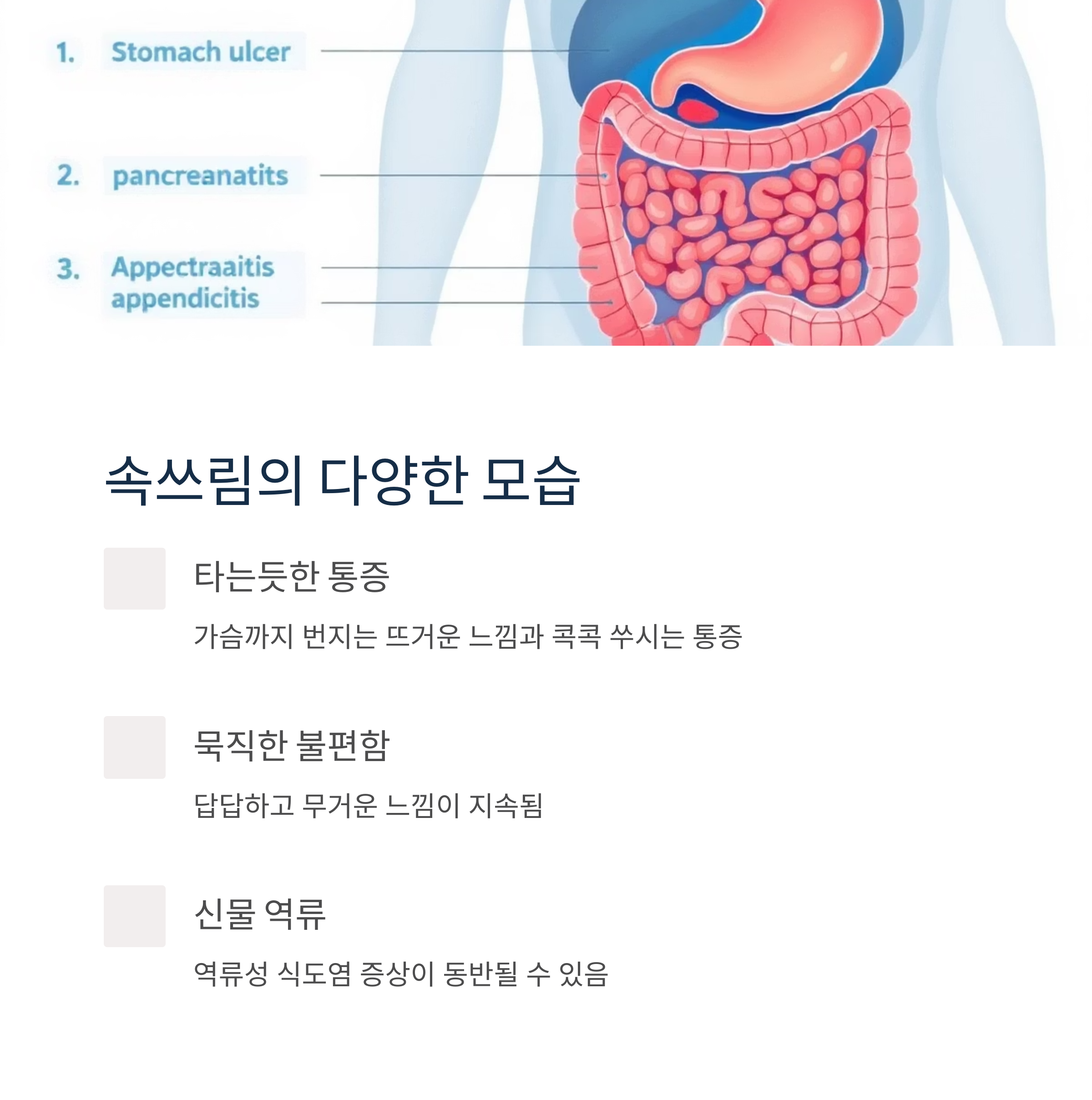 속이 쓰리고 아플 때, 다들 한번쯤은 경험해보셨죠? 그냥 잠깐 불편한 정도일 수도 있지만, 때로는 숨쉬기조차 힘들 정도로 심하게 나타나기도 하죠. 어떤 경우에는 속이 타는 듯한 뜨거운 느낌과 함께 콕콕 쑤시는 듯한 통증이 있고, 어떤 때는 묵직하고 답답한 느낌이 드는 경우도 있어요.