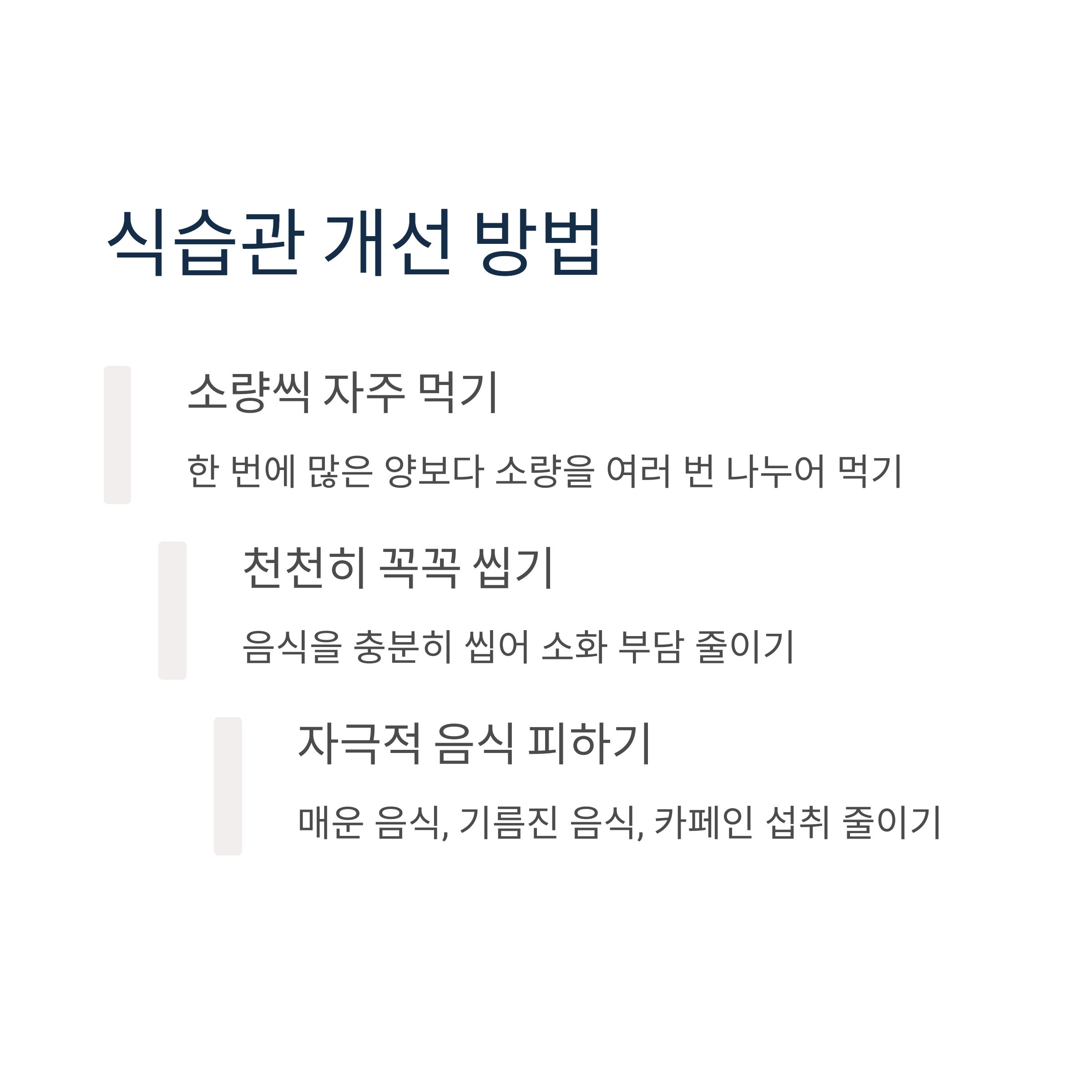 속쓰림과 복통을 예방하고 완화하는 데 도움이 되는 몇 가지 생활 습관들을 소개해 드릴게요. 가장 중요한 것은 바로 식습관 개선이에요. 규칙적인 식사 시간을 갖고, 한 번에 많은 양을 먹는 것보다는 소량씩 여러 번 나누어 먹는 것이 좋아요.