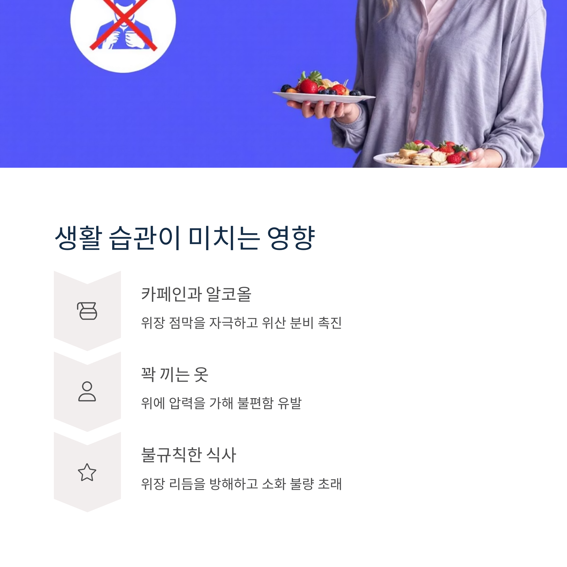 규칙적인 식사, 스트레스 관리, 적절한 운동, 충분한 수면 등은 위장 건강에 매우 중요한 요소에요. 또한, 금주와 금연은 위장 건강을 지키는 데 필수적이라고 할 수 있죠. 그리고, 평소 맵거나 자극적인 음식을 즐겨 드셨다면 당분간은 부드럽고 소화가 잘 되는 음식 위주로 식단을 바꿔보는 것을 추천드려요.