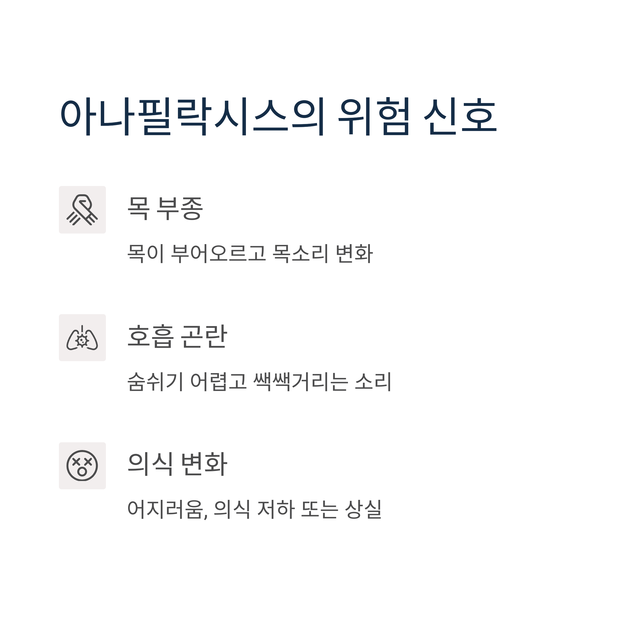 음식이나 약, 벌에 쏘이는 등의 알레르기 반응이 심각해지면 목이 부어오르고 숨쉬기가 힘들어지는 아나필락시스가 발생할 수 있어요. 이건 정말 위급한 상황이에요. 목이 부어오르고 목소리가 변하거나, 숨쉬기가 어렵고 쌕쌕거리는 소리가 나면서, 어지러움증이나 의식을 잃을 수도 있습니다.