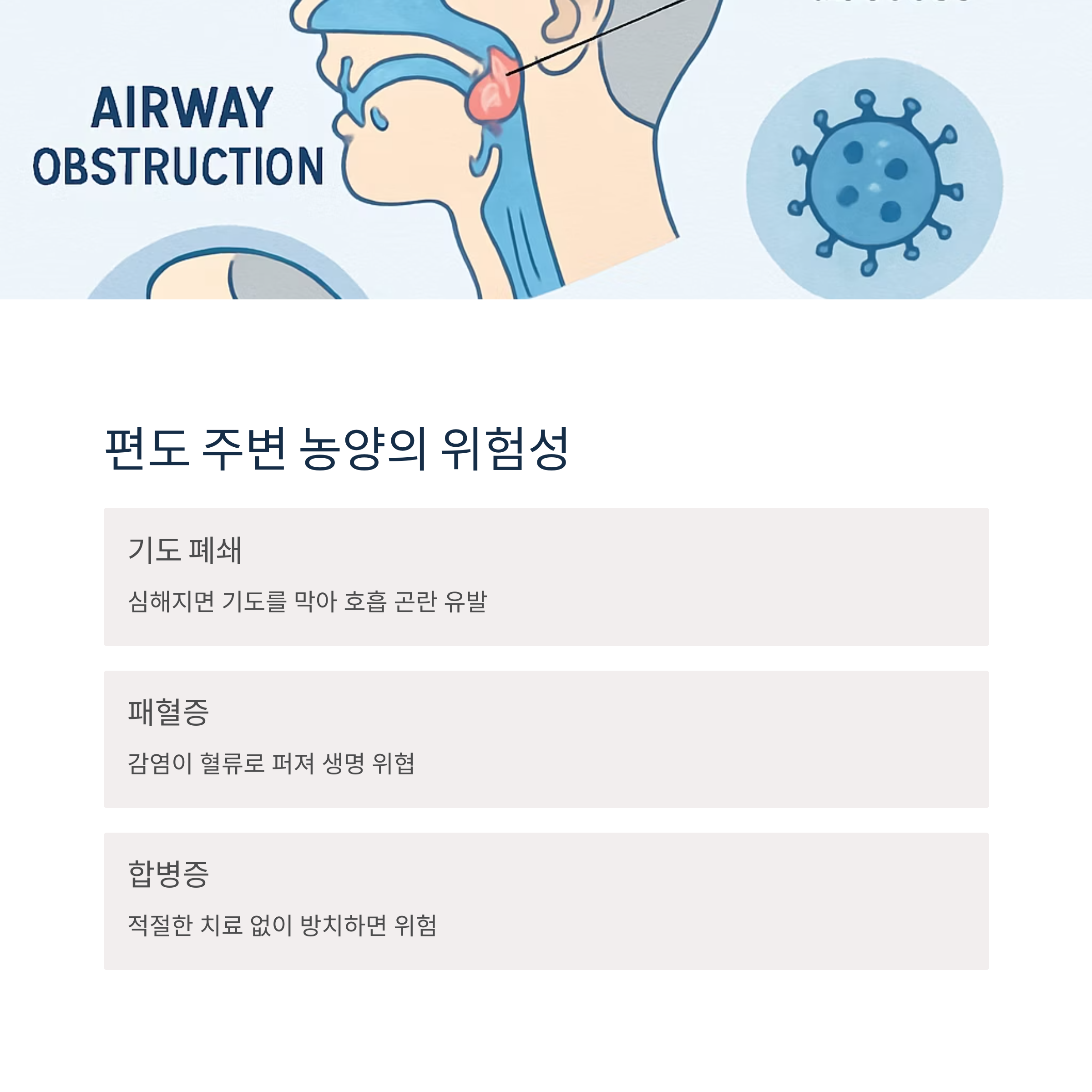 이럴 때는 절대 집에서 치료하려고 하면 안 돼요. 고름을 빼내는 시술을 해야 하고, 항생제도 함께 투여해야 합니다. 너무 아파서 약을 삼키기 어렵다면 주사로 항생제를 맞는 게 더 나아요. 주사는 혈액 속 항생제 농도를 빠르게 높여 감염이 더 퍼지는 것을 막고 염증을 빨리 가라앉히는 데 도움이 되거든요. 농양이 심해지면 기도를 막아서 숨을 쉴 수 없게 되거나, 생명까지 위협하는 패혈증으로 이어질 수 있으니, 증상이 나타나면 바로 병원 응급실로 달려가세요!