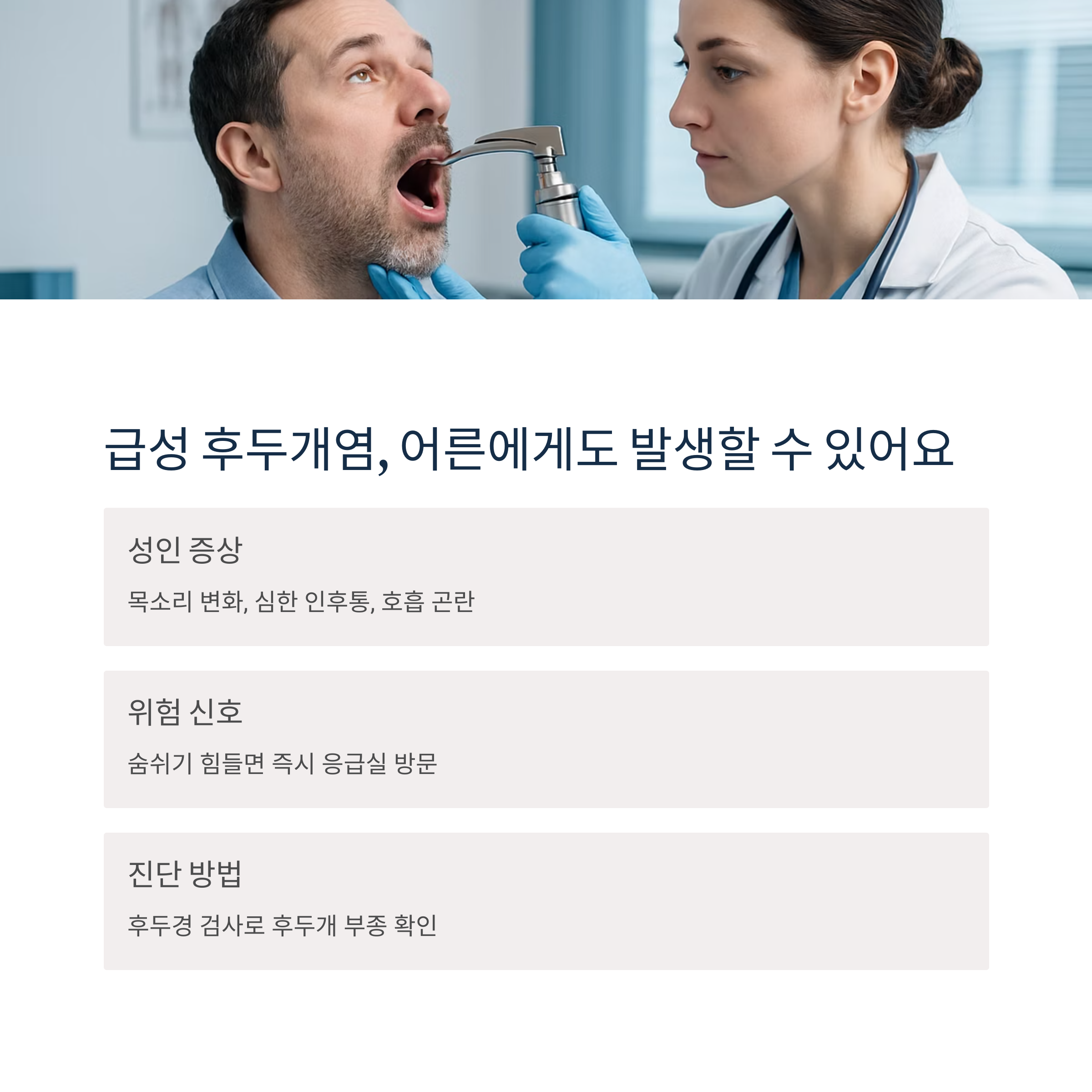 급성 후두개염은 후두 덮개에 염증이 생기는 질환인데, 특히 어린아이들에게 위험해요. 목이 아프고 침을 흘리며, 무엇보다 숨쉬기가 힘들어지는 증상이 나타나죠. 후두덮개는 기도를 막는 역할을 하기 때문에, 부어오르면 숨을 쉴 수 없게 되는 위험한 상황이 생길 수 있어요. 열이 나면서 증상이 빠르게 악화되기도 합니다.