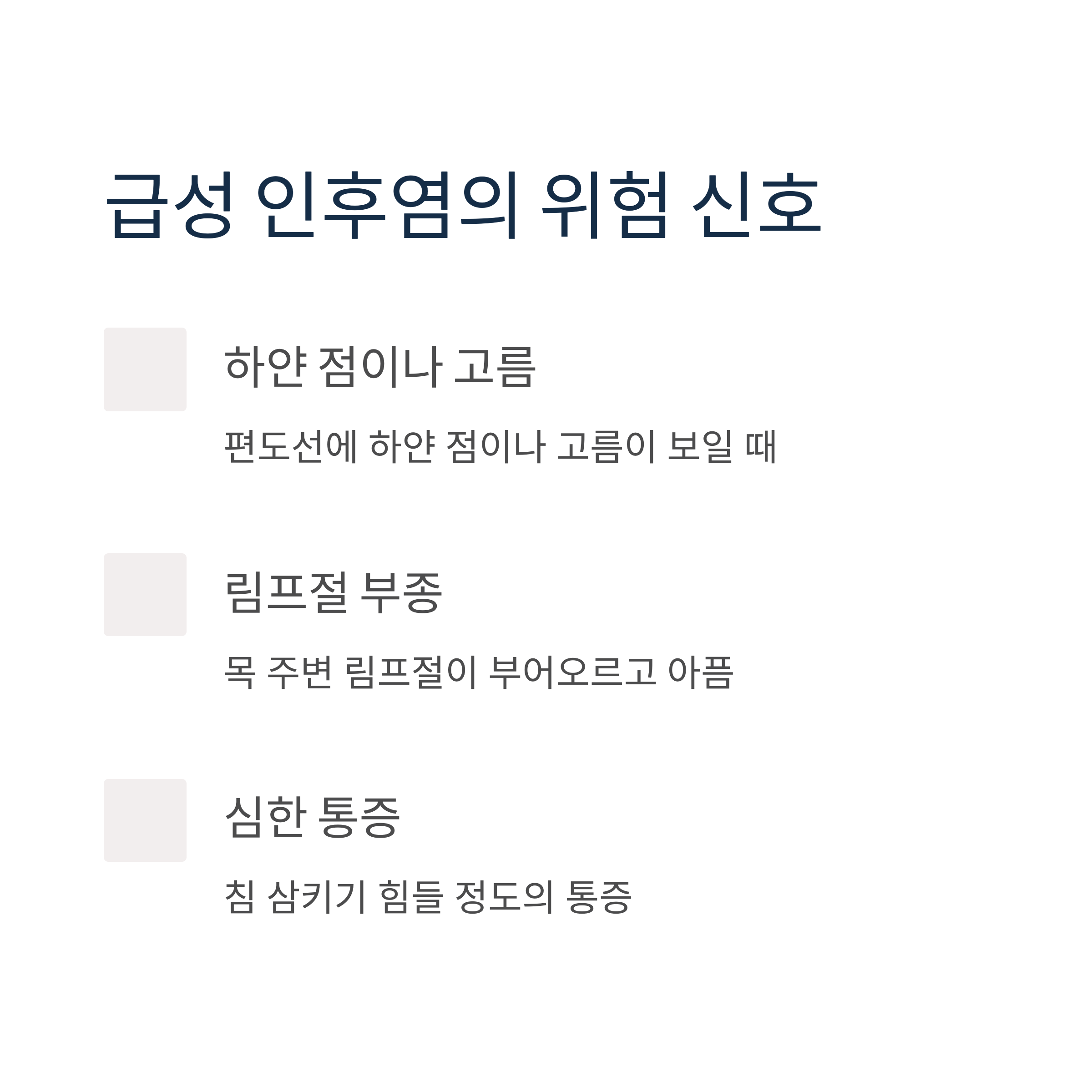 급성 세균성 인후염을 제대로 치료하지 않으면, 세균 감염이 편도 주변으로 번져 편도 주변 농양이 생길 수 있어요. 편도 주변에 고름이 차는 건데, 목이 너무 아파서 침을 삼키는 것조차 힘들 정도로 고통스럽고, 열도 많이 나고, 목소리까지 변할 수 있어요. 입을 크게 벌리기 힘들거나, 목 한쪽이 심하게 부어오르면 농양을 의심해봐야 합니다.