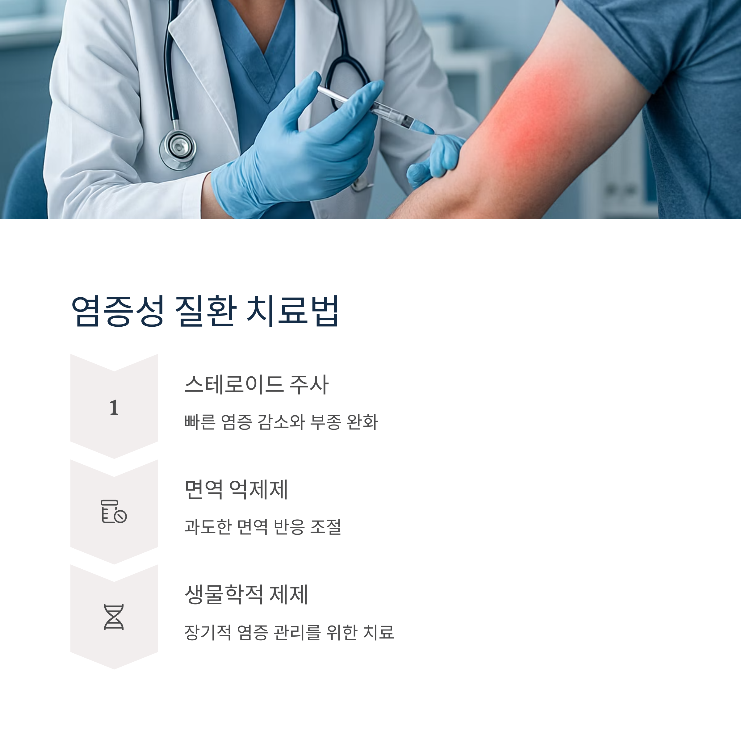치료는 염증을 가라앉히고 면역 체계를 조절하는 데 초점을 맞춰요. 스테로이드 주사로 염증을 빨리 가라앉히고 부종을 줄일 수 있고, 장기적으로는 면역 억제제나 생물학적 제제를 사용할 수 있습니다. 약을 삼키기 어렵다면 주사가 효과적이에요. 하지만 무엇보다 정확한 진단이 중요해요. 의사는 환자의 병력과 검사 결과를 종합적으로 판단하여 원인을 찾고 치료 계획을 세웁니다.