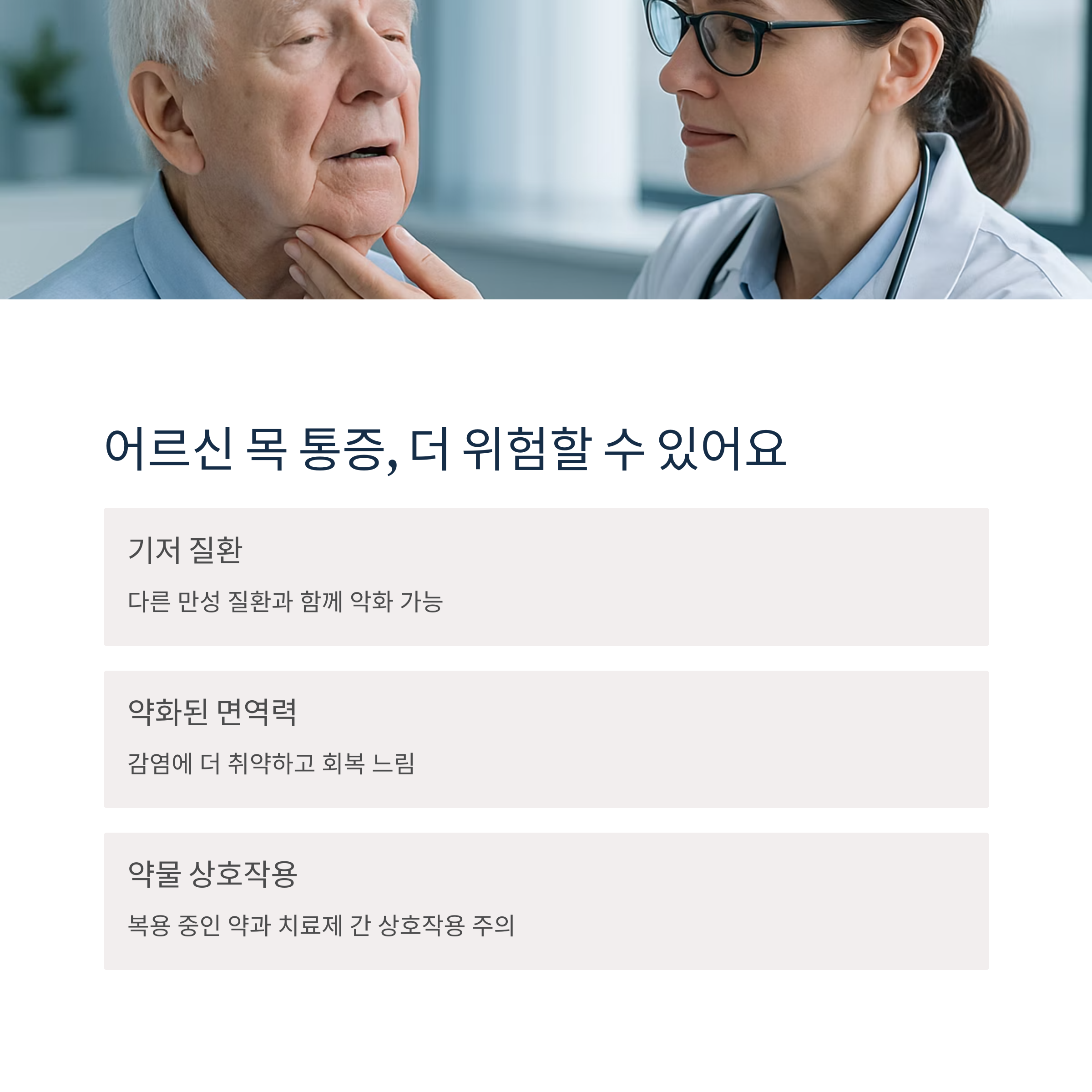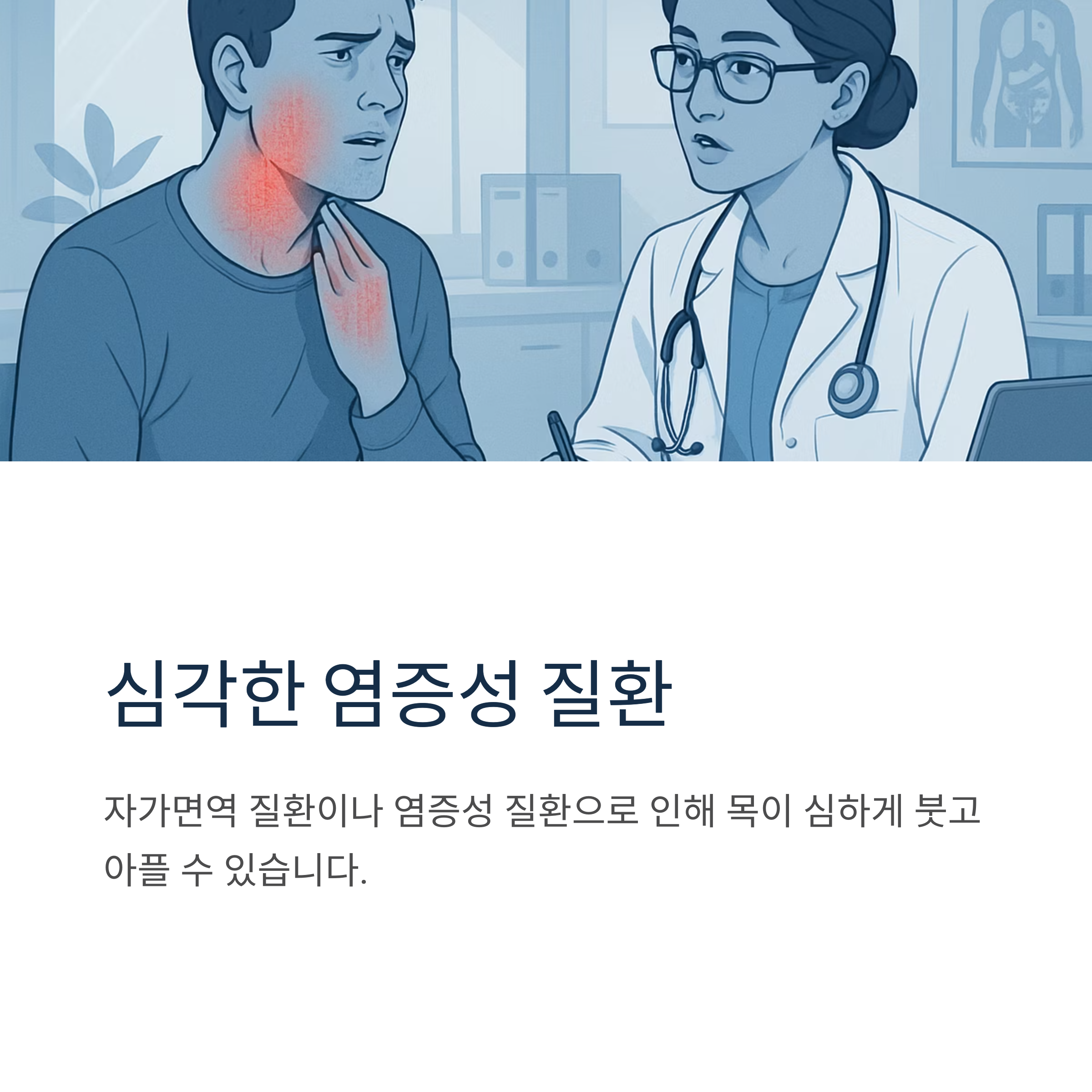 드물지만, 류마티스 관절염이나 루푸스 같은 자가면역 질환, 베체트병 같은 염증성 질환 때문에 목이 심하게 붓고 아플 수 있어요. 몸의 면역 체계가 자기 조직을 공격해서 염증이 생기는 건데, 목이 너무 부어서 침 삼키기 힘들 정도로 고통스러울 수 있습니다. 이런 질환이 있다면 목의 통증이나 부종이 심해지면 빨리 전문의 진료를 받아야 합니다.