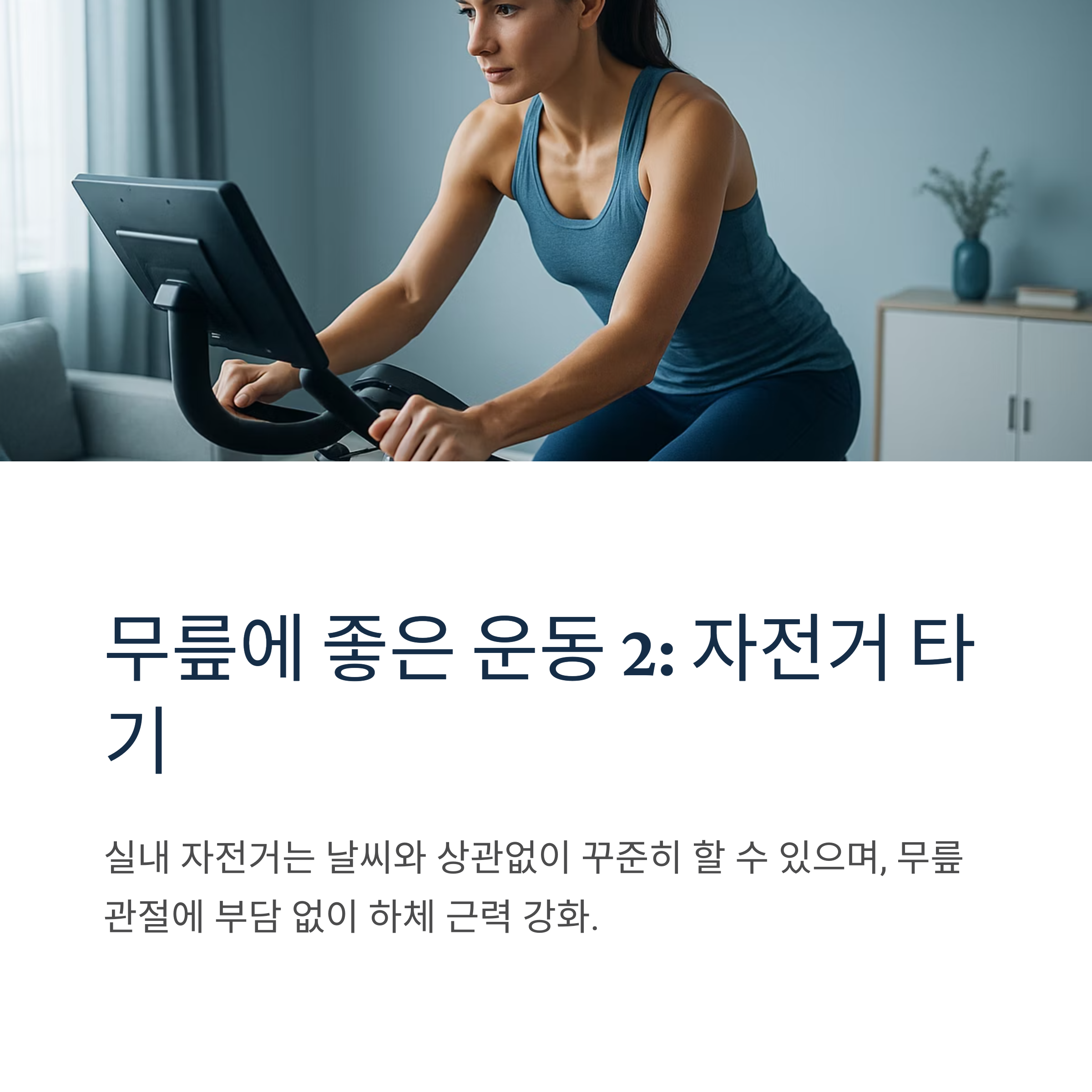 자전거 타기도 좋아요. 특히 실내 자전거는 날씨에 상관없이 꾸준히 운동할 수 있다는 장점이 있죠. 걷기는 어떨까요? 평지를 걷는 것은 무릎에 무리를 주지 않으면서 근력을 키우는 데 도움이 돼요.