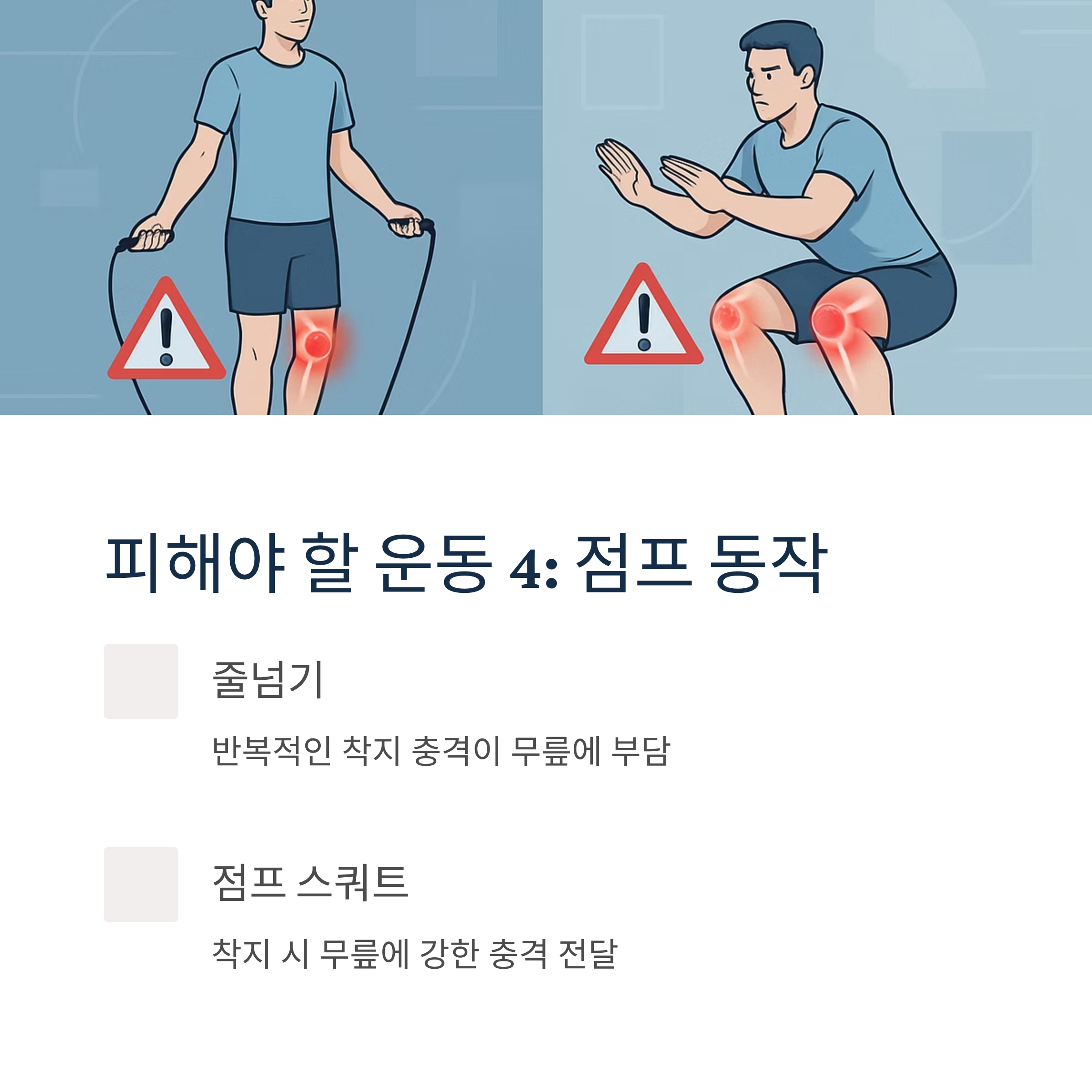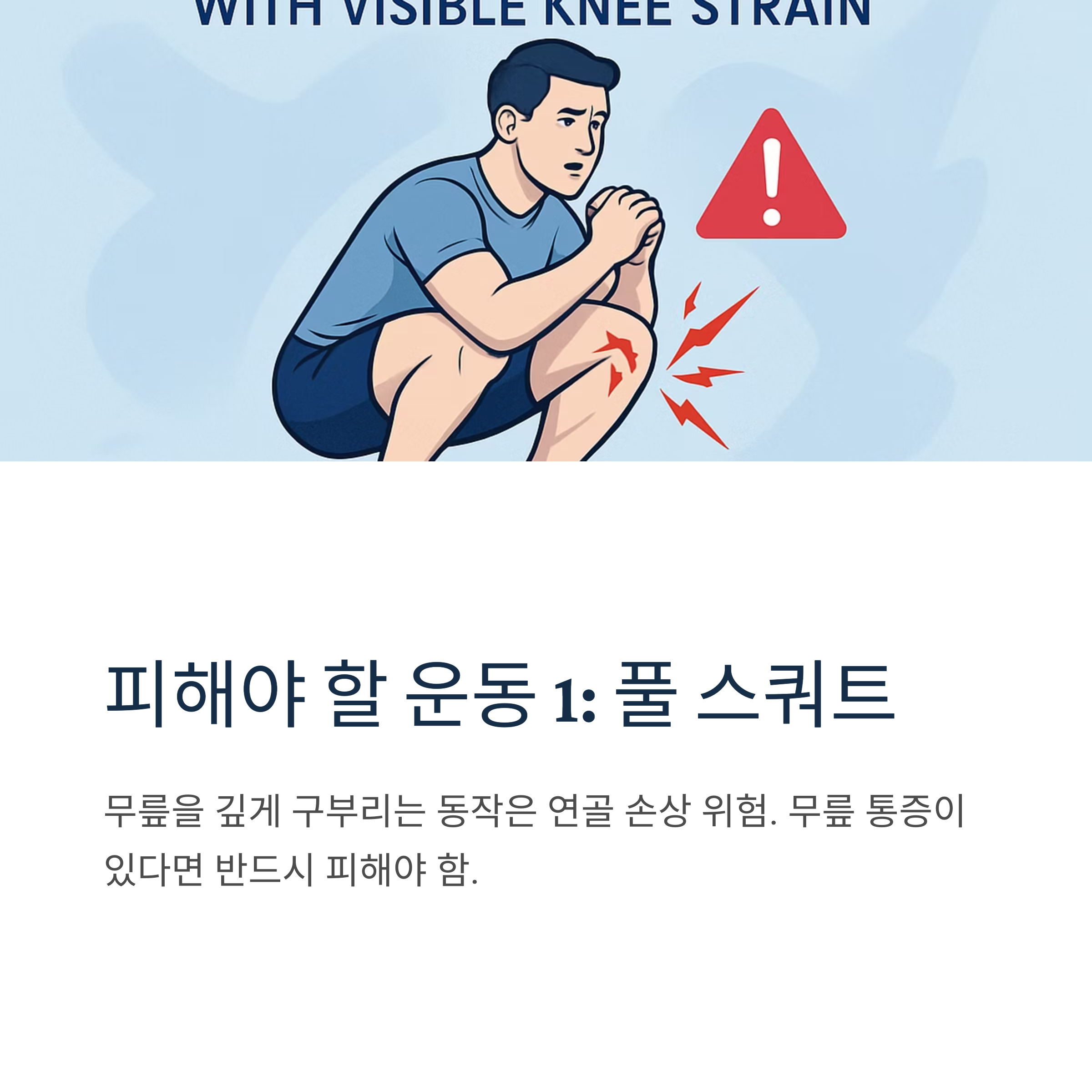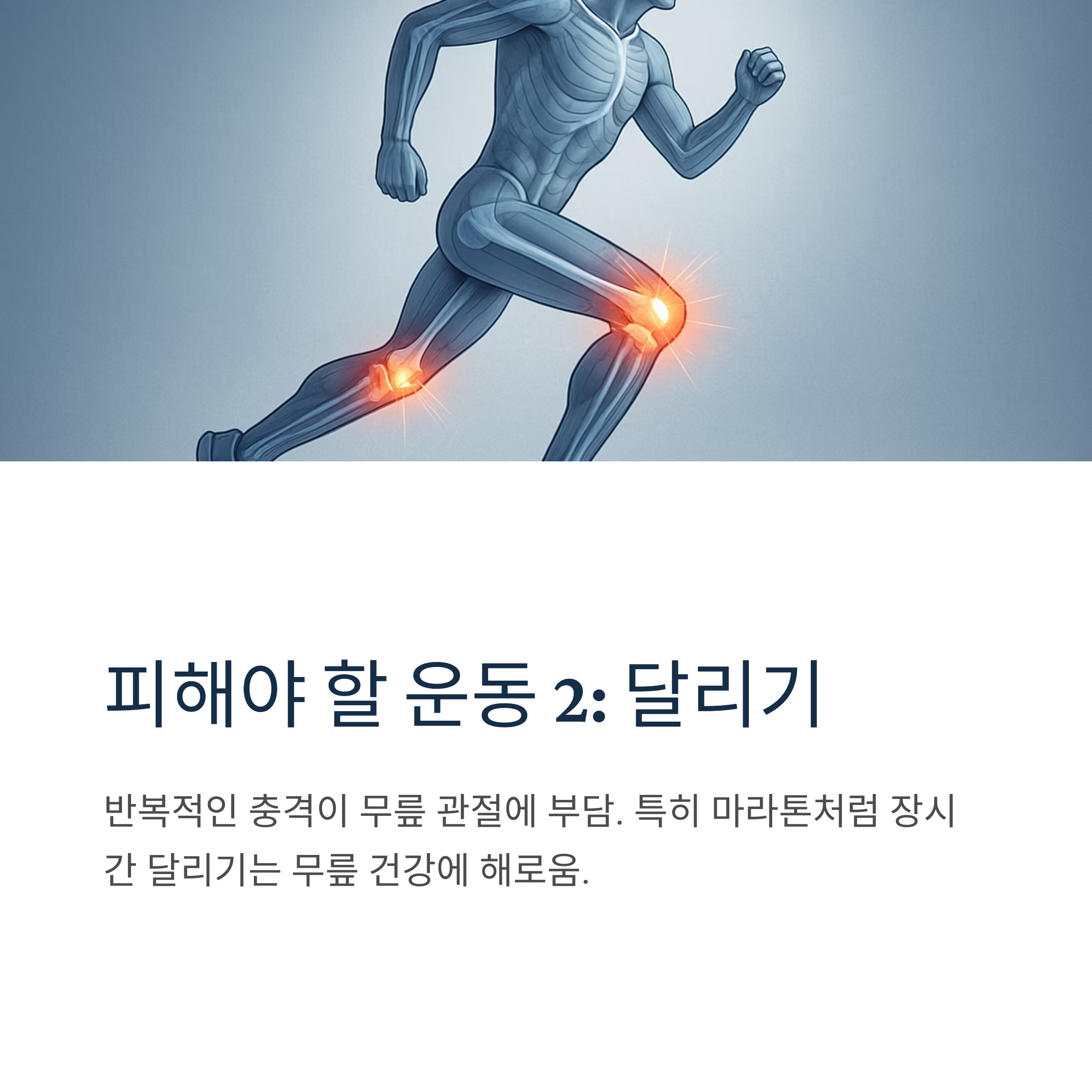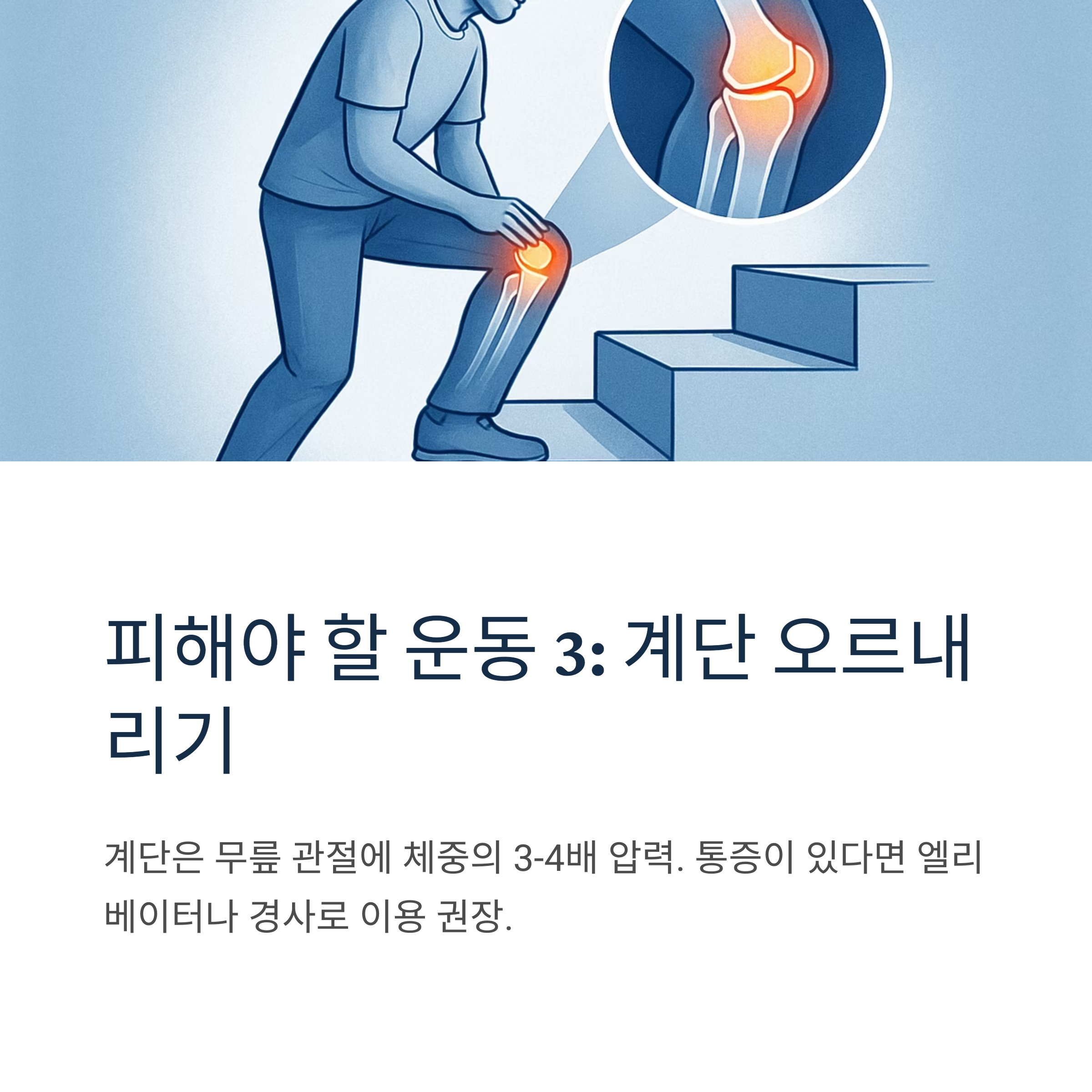 무릎 통증에 절대 하면 안 되는 운동들이 있어요. 풀 스쿼트처럼 무릎에 큰 부담을 주는 운동은 연골 손상을 유발할 수 있고요. 달리기나 마라톤처럼 무릎에 반복적인 충격을 주는 운동도 무릎 건강에 좋지 않아요. 계단 오르내리기는 무릎 관절에 큰 부담을 주기 때문에 피하는 게 좋고요.