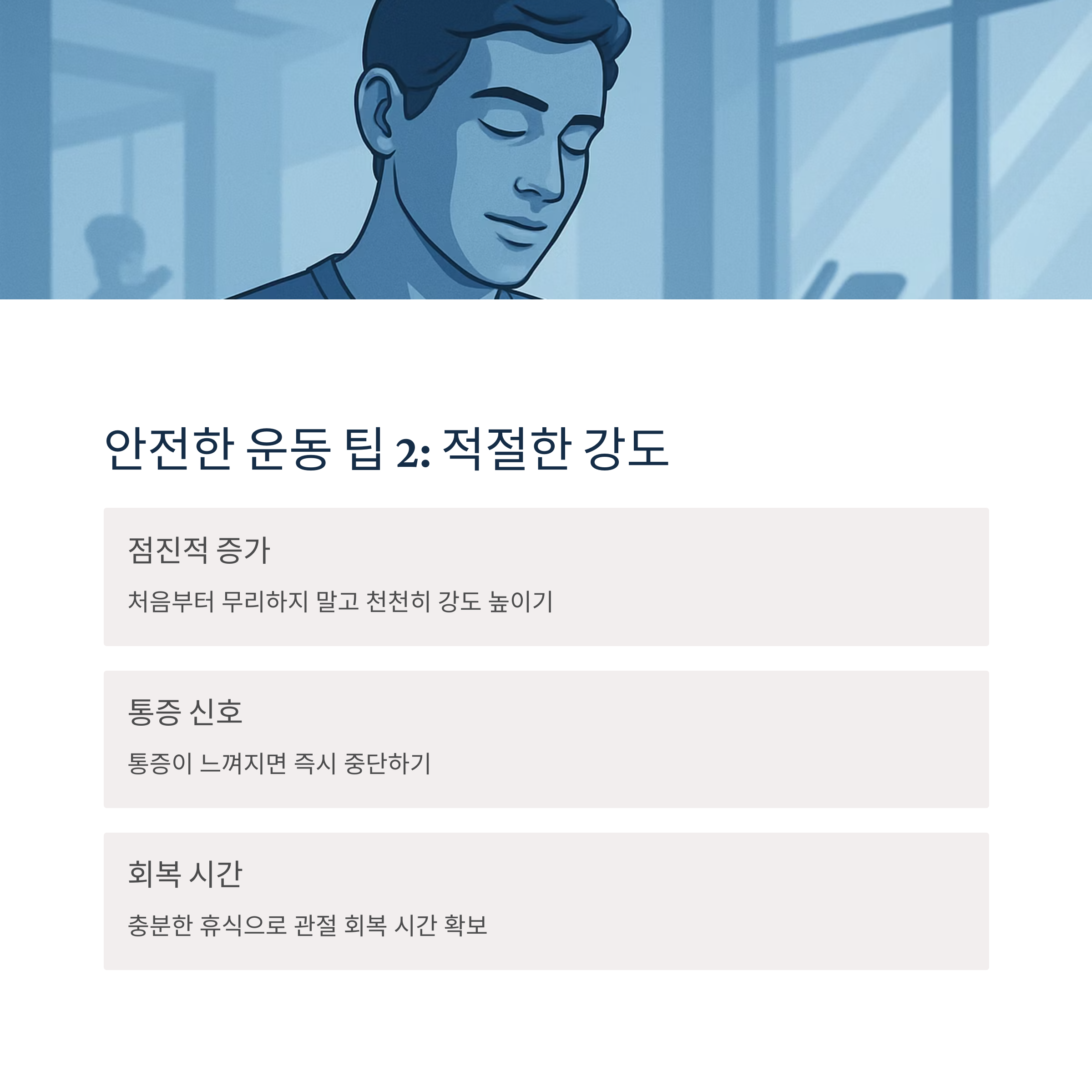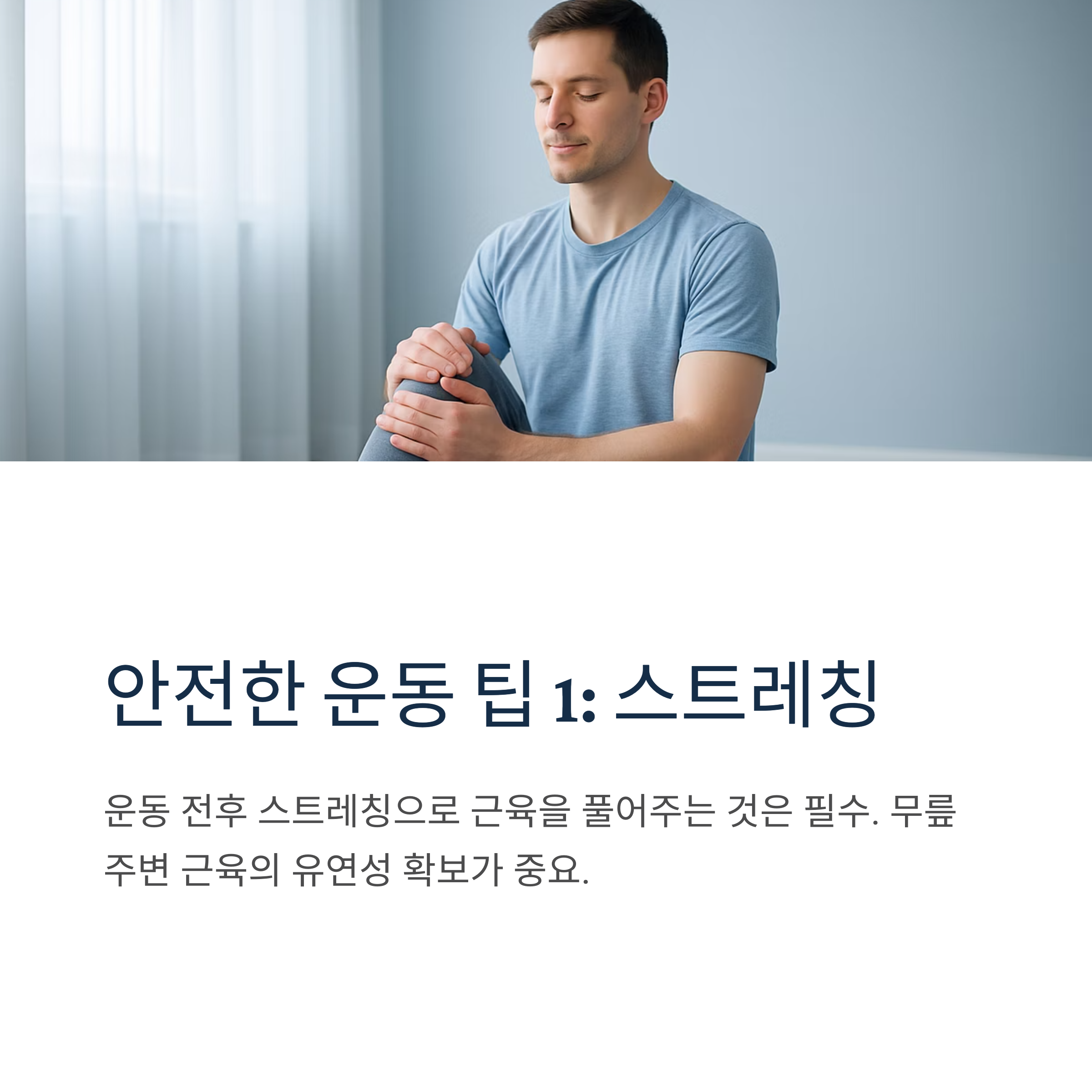 무릎 건강을 위한 운동은 '안전'이 최우선입니다. 운동 전후 스트레칭으로 근육을 풀어주는 것은 필수이고요. 적절한 강도로 운동하는 것도 중요해요. 처음부터 너무 무리하면 오히려 역효과를 불러올 수 있거든요.