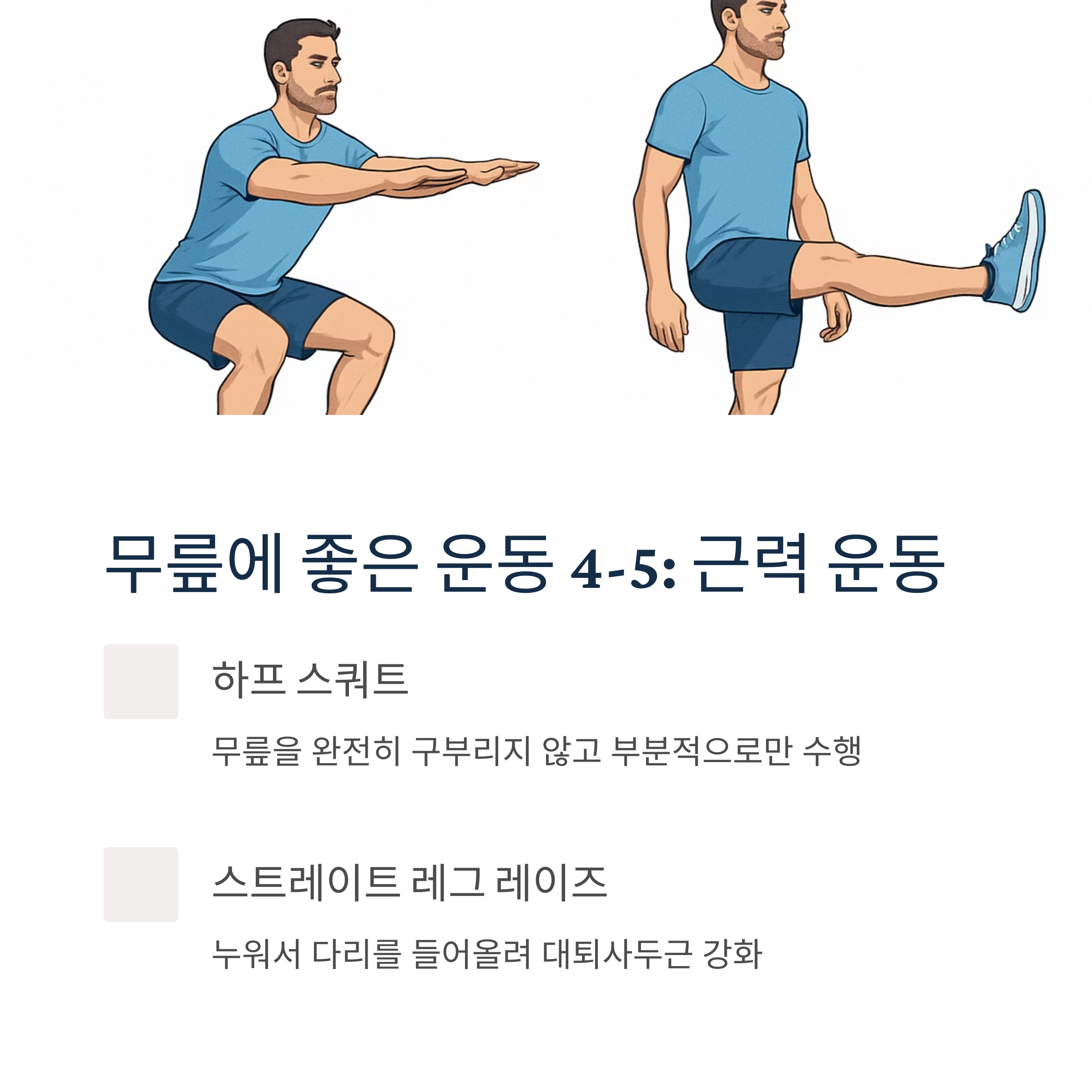 그리고 하프 스쿼트와 스트레이트 레그 레이즈처럼 근육을 강화하는 운동도 도움이 됩니다. 하지만 중요한 건, 내 몸에 맞는 강도로, 꾸준히 하는 거예요. 처음부터 무리하지 마시고, 천천히 시작해서 점차 강도를 높여 나가는 것이 무릎 건강을 지키는 비결이에요.