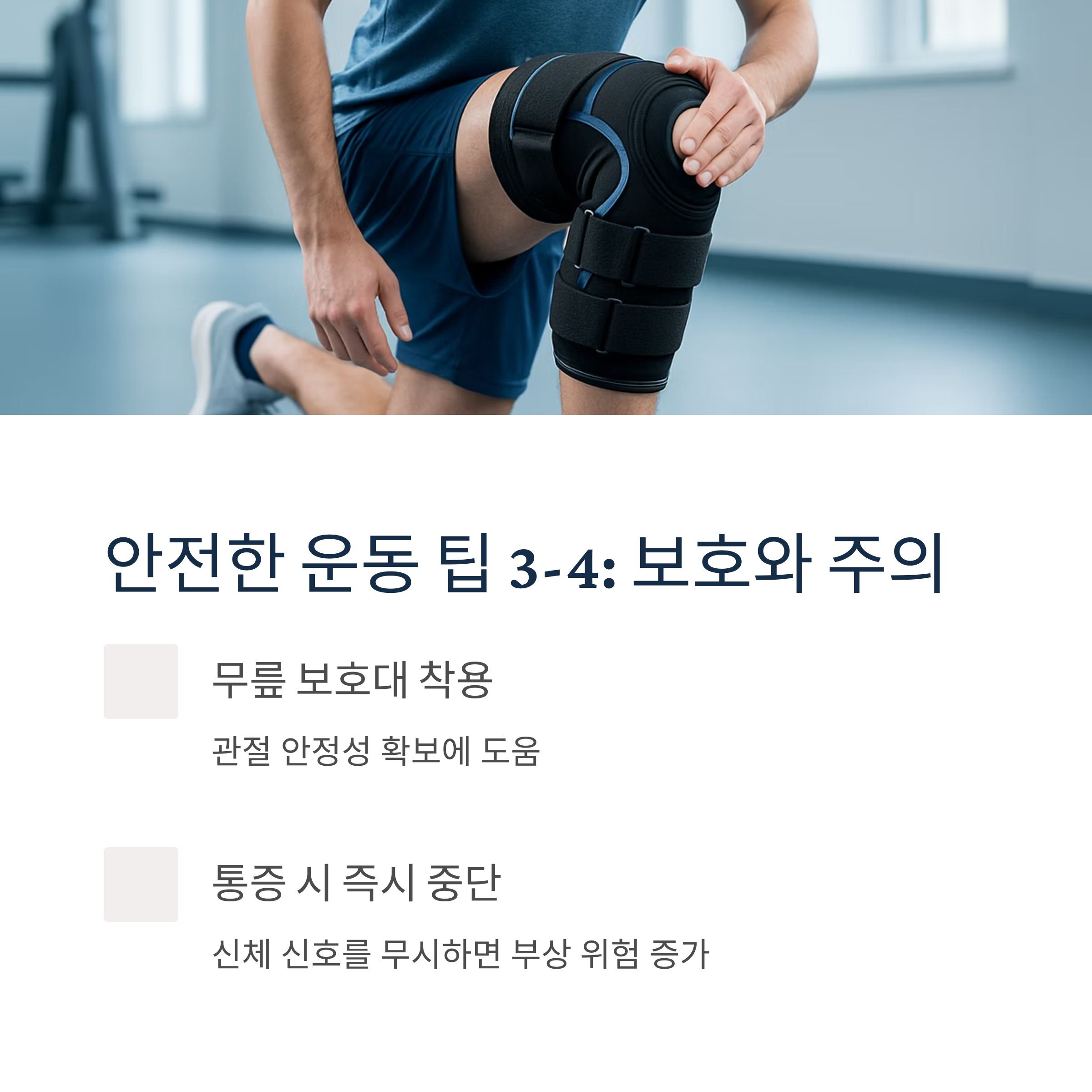 무릎 보호대를 착용하면 무릎 관절을 보호하는 데 도움이 되고요. 가장 중요한 것은 무릎이 아플 때는 즉시 운동을 중단하는 거예요. 내 몸의 신호를 무시하면 더 큰 부상으로 이어질 수 있으니까요. 무리하지 않는 선에서 꾸준히 운동하는 것이 무릎 건강을 지키는 가장 좋은 방법이에요.
