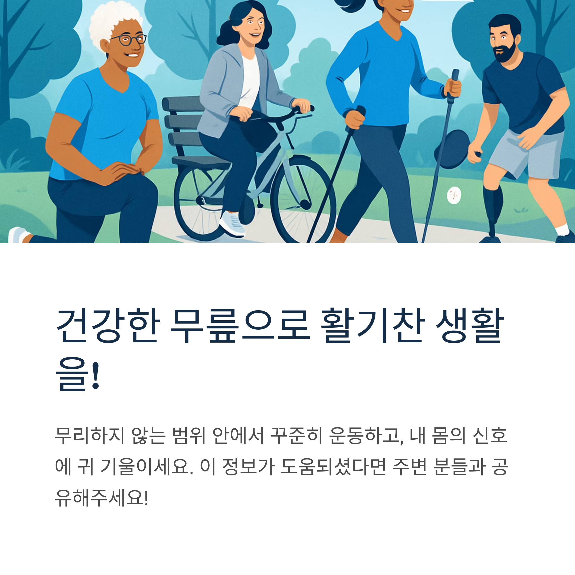 무릎 건강을 위한 운동은 장기적인 계획이 필요해요. 오늘 알려드린 정보가 여러분의 건강한 무릎 관리에 도움이 되기를 바랍니다. 꾸준한 노력으로 건강한 무릎, 건강한 삶을 만들어나가세요! 무리하지 않는 범위 안에서 꾸준히 운동하고, 내 몸의 신호에 귀 기울이며 건강을 관리하면 분명 좋은 결과를 얻을 수 있을 거예요! 건강한 무릎으로 활기찬 생활을 즐기세요!