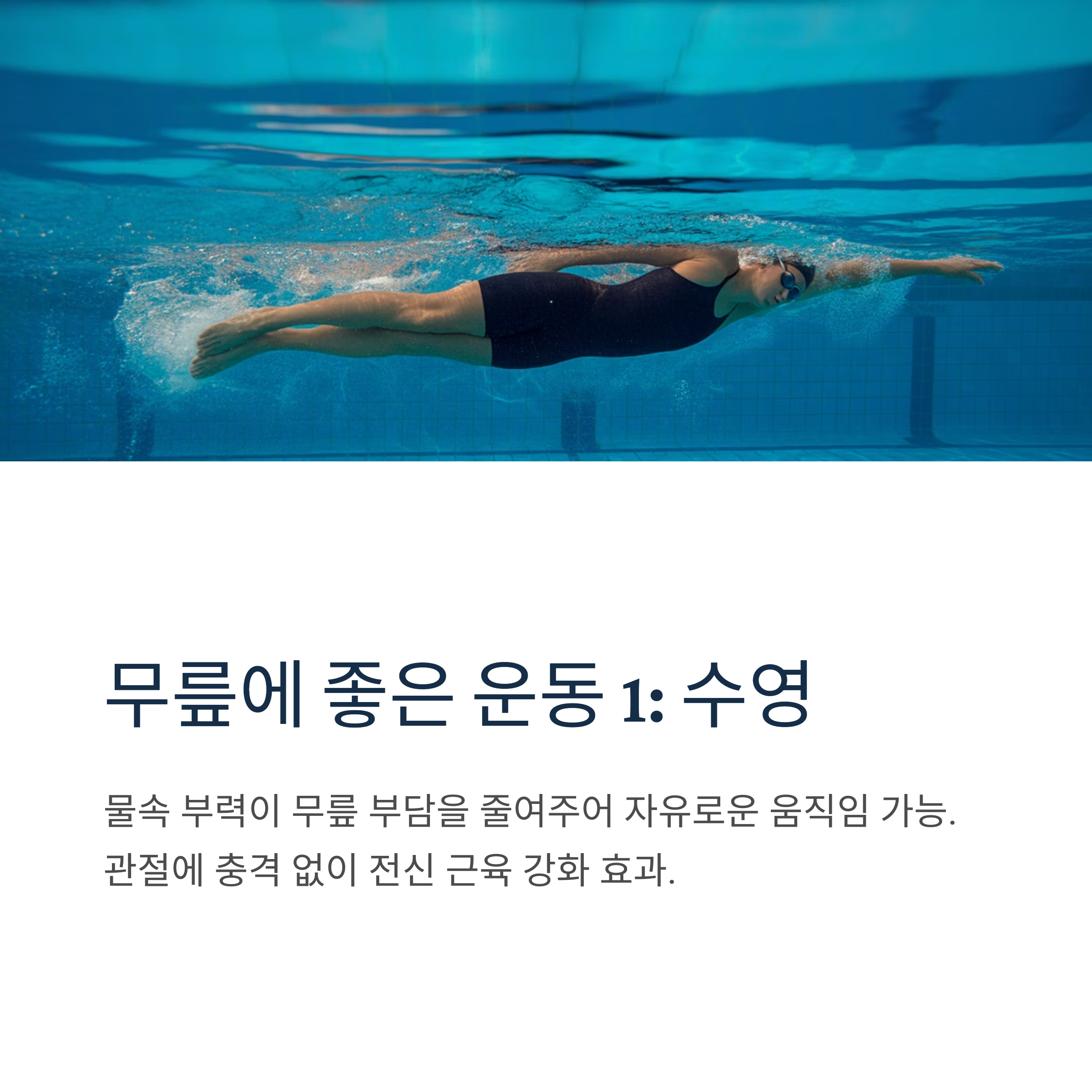 무릎이 통증에 좋은 운동은 '부드러움'과 '꾸준함'이 핵심이에요. 격렬한 운동은 잠시 즐거울 수 있지만, 결국 무릎에 부담을 주고 통증을 악화시킬 수 있거든요. 저는 개인적으로 수영을 추천해요. 물속에서는 부력 덕분에 무릎에 가해지는 부담이 줄어들어 자유롭게 움직일 수 있거든요.