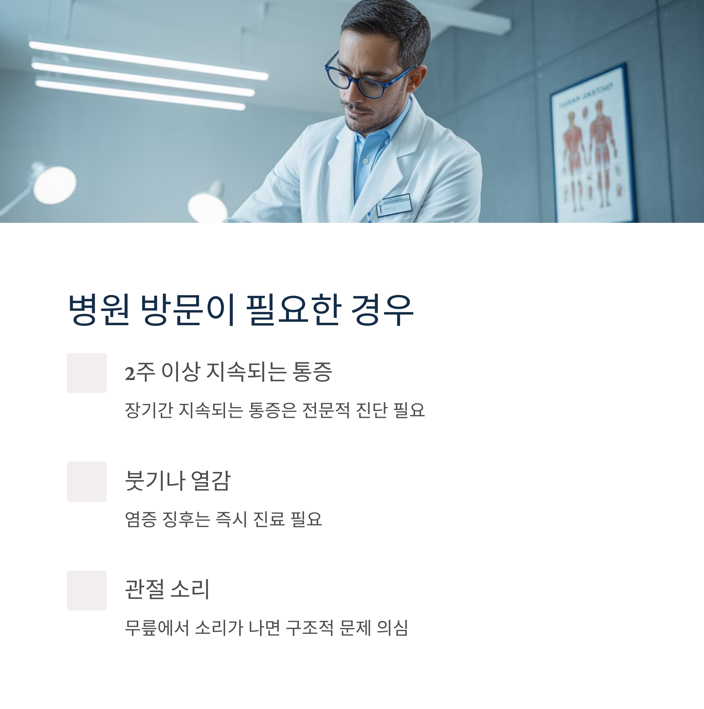 붓거나 열이 나거나 무릎에서 소리가 나는 경우도 바로 병원에 가는 것이 좋아요. 전문적인 진료를 통해 정확한 원인을 파악하고 적절한 치료를 받는 것이 무릎 건강을 회복하는 가장 빠른 길이에요. 내 몸을 잘 살펴 적절한 시기에 병원을 찾는 것 또한 건강을 지키는 현명한 방법 중 하나랍니다.