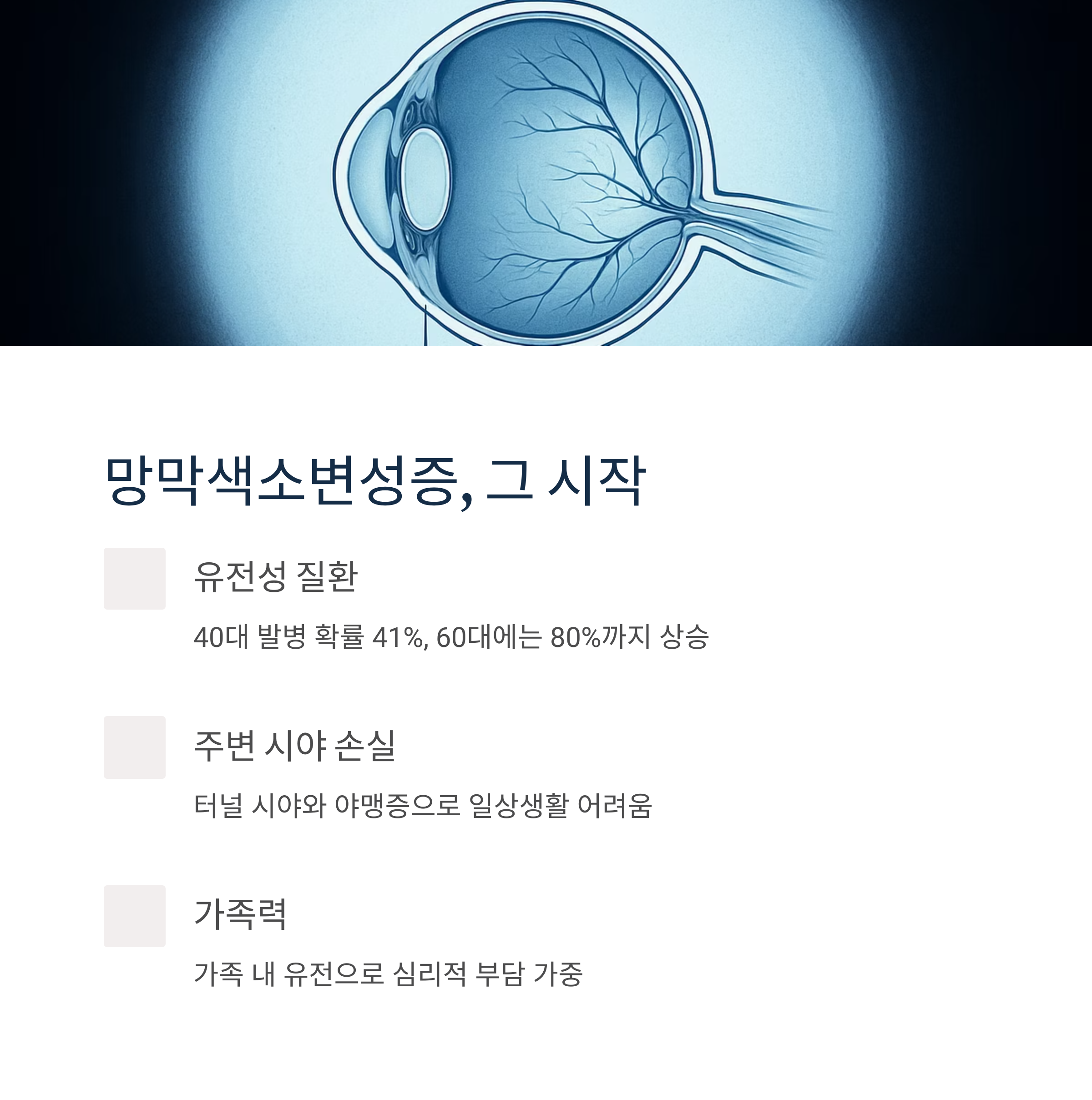 이름만 들어도 막막하시죠? 저도 처음엔 그랬어요. 유전 질환이라니, 듣기만 해도 힘이 빠지더라고요. 환자분께서는 40대에 발병 확률이 41%나 된다는 사실에 굉장히 불안해하셨어요. 60대가 되면 80%까지 올라간다니 더 걱정이셨죠. 주변 시야부터 좁아지기 시작해서, 점점 세상이 좁아지는 기분이라고 하시더라고요. .
