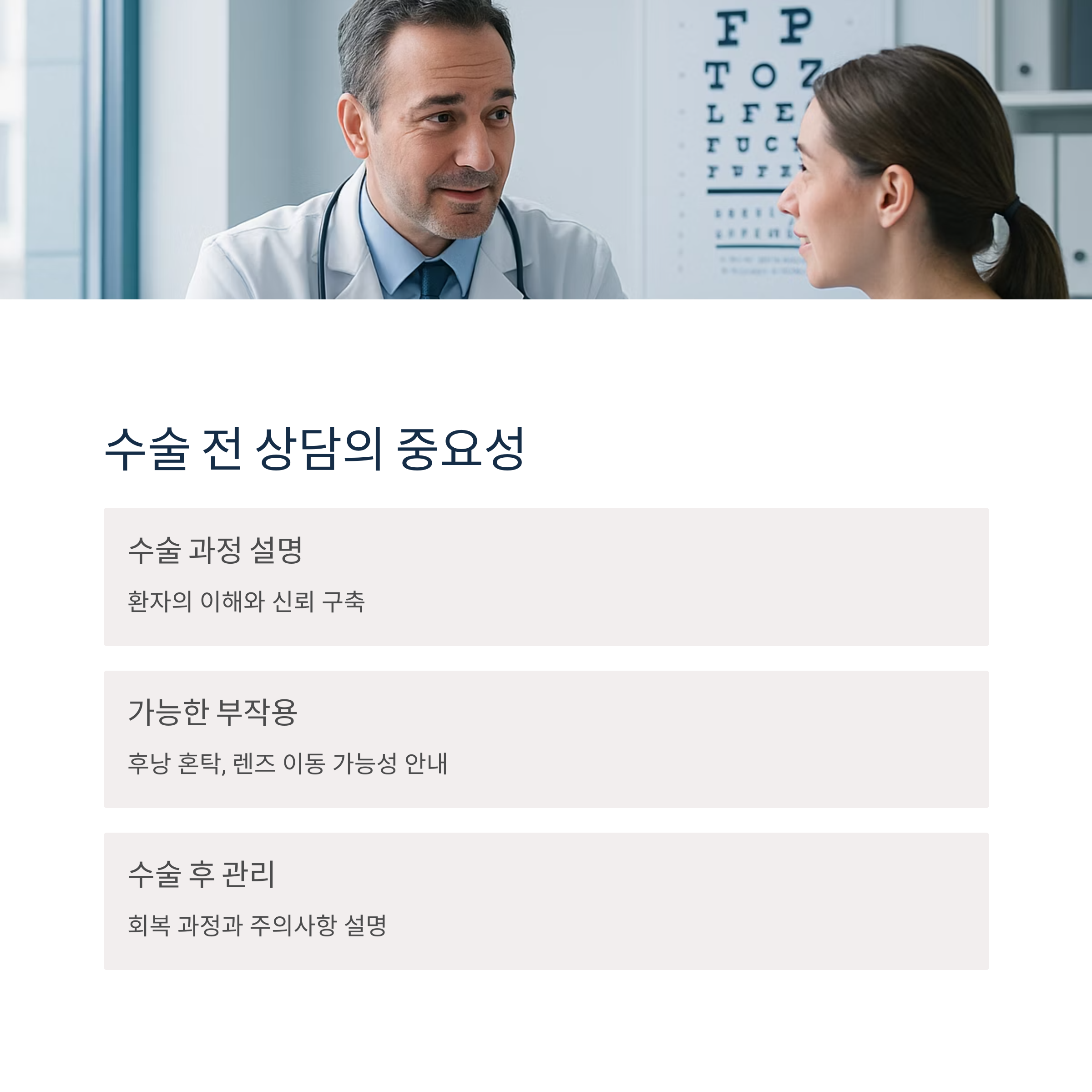수술 전, 환자분과 충분히 상담하고 수술의 과정과 수술 후 관리 방법에 대해 자세히 설명해드렸습니다. 망막 질환 환자의 경우, 수술 후 후낭 혼탁이나 렌즈 삽입 후 전낭 수축으로 인한 렌즈 이동 가능성 등 여러 가지 부작용을 고려해야 하기 때문입니다.