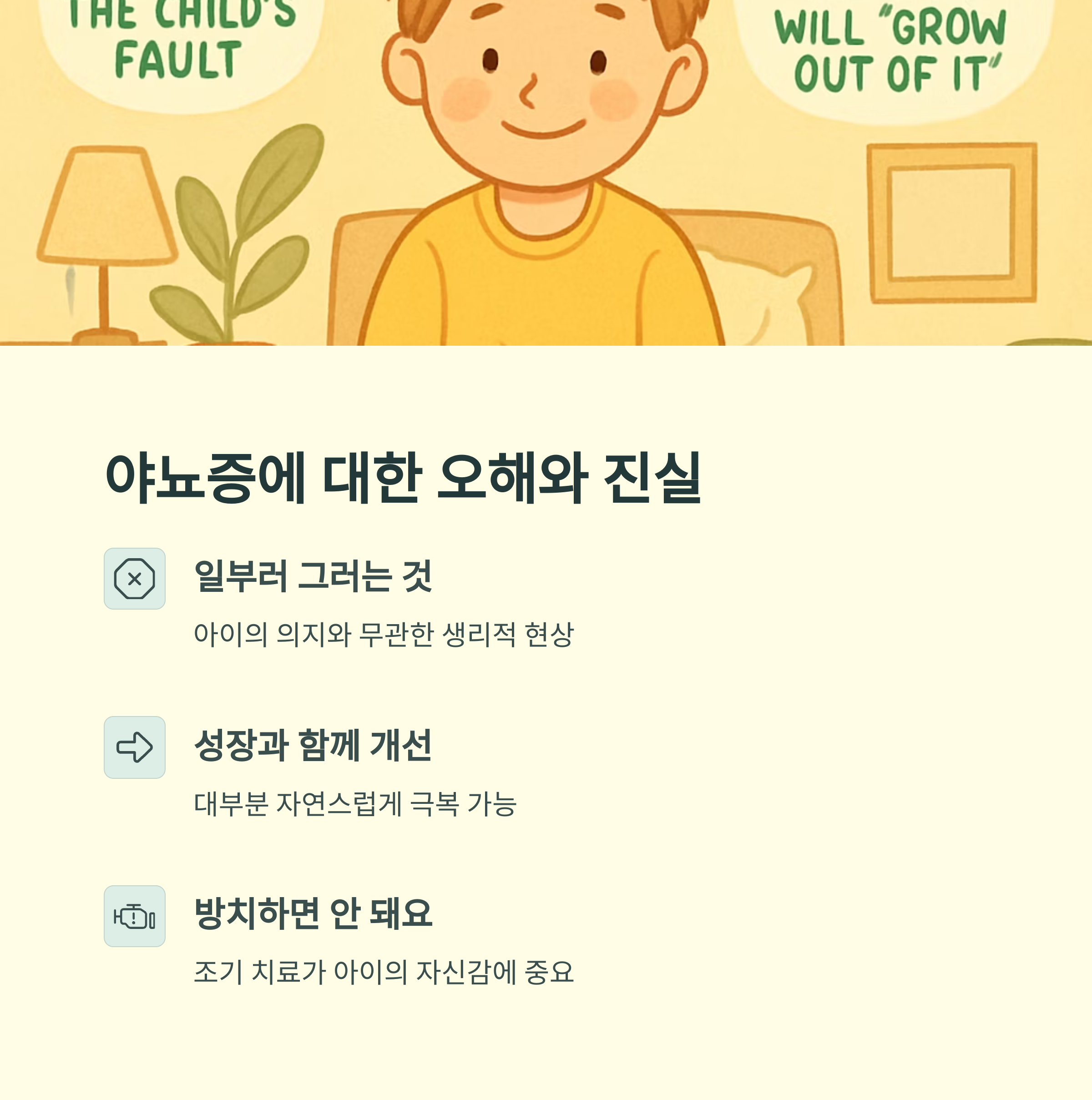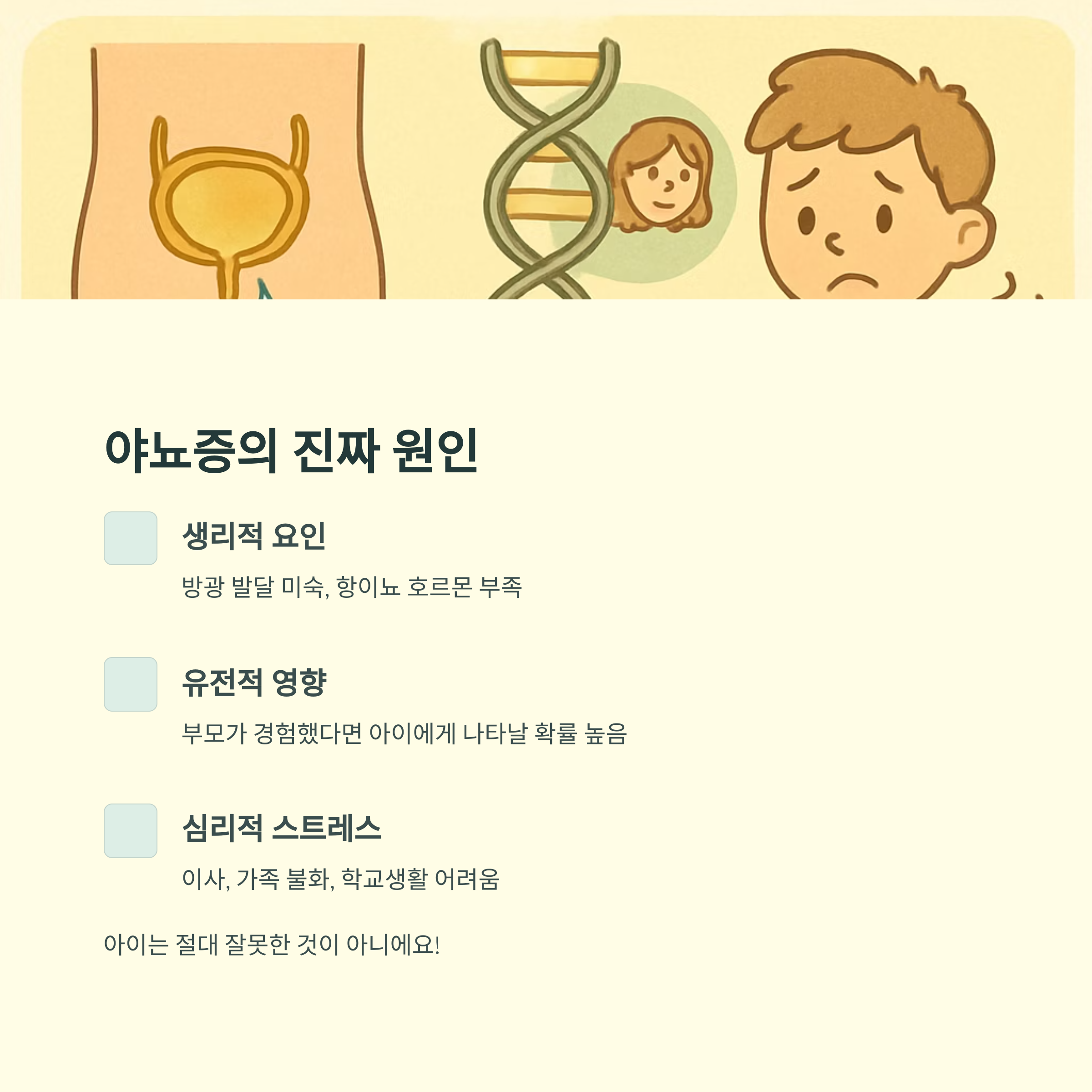 야뇨증은 아이가 일부러 그러는 것이 아니에요. 아이의 의지와는 전혀 상관없이 생리적, 심리적 원인으로 발생하는 문제입니다. 혼내거나 꾸중한다고 해서 좋아지지 않고, 오히려 아이에게 스트레스를 주어 증상을 악화시킬 수 있어요.