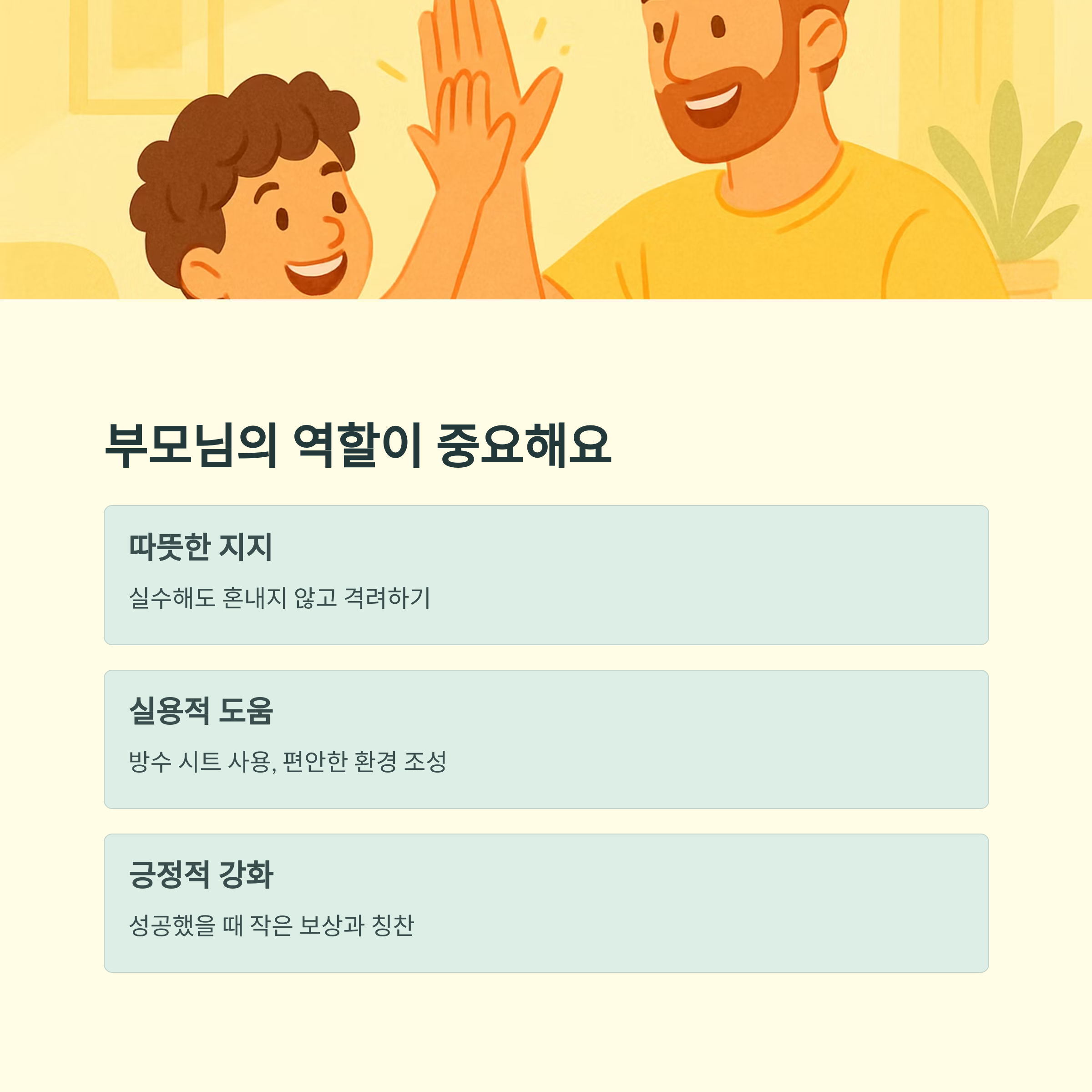 부모님의 역할도 중요한데요, 아이가 실수하더라도 혼내지 않고 격려하며 따뜻하게 대해주는 것이 중요해요. 침대에 방수 시트를 깔아 아이의 스트레스를 줄여주는 것도 좋은 방법입니다. 아이가 밤에 화장실에 쉽게 갈 수 있도록 수면 환경을 조성해주는 것도 잊지 마세요. 충분한 조명과 편리한 통로를 확보하고, 필요하다면 야뇨를 감지하는 알람 장치를 사용하는 것도 도움이 될 수 있습니다.