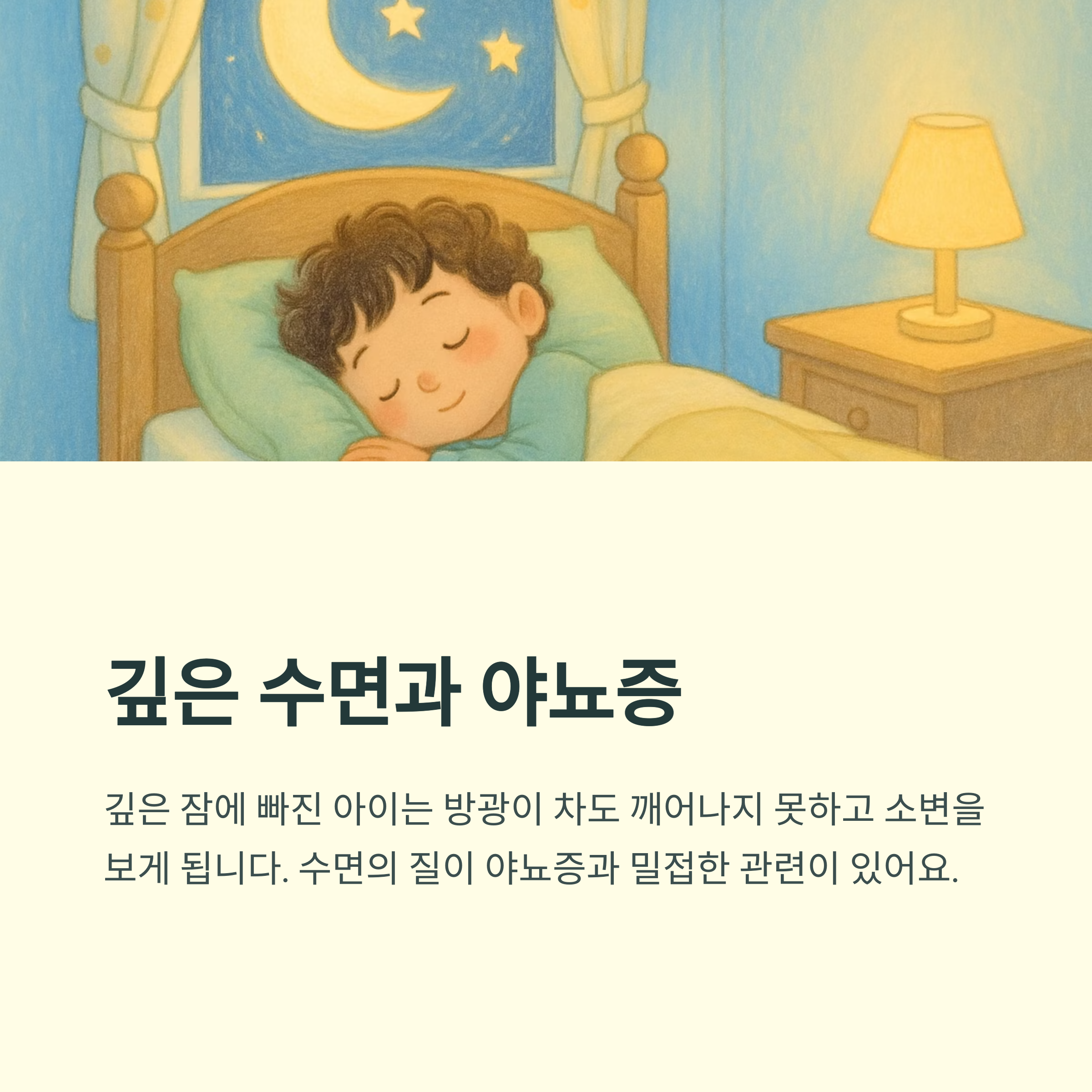 안녕하세요. 아이의 밤잠을 방해하는 야뇨증으로 힘들어하시는 부모님들께 작은 도움이 되고자 이 글을 씁니다. 우리 아이의 건강하고 쾌적한 수면을 위한 정보들을 함께 나누고, 걱정과 불안을 조금이나마 덜어드릴 수 있도록 최선을 다하겠습니다. 함께 야뇨증을 이해하고 극복해 나가요!