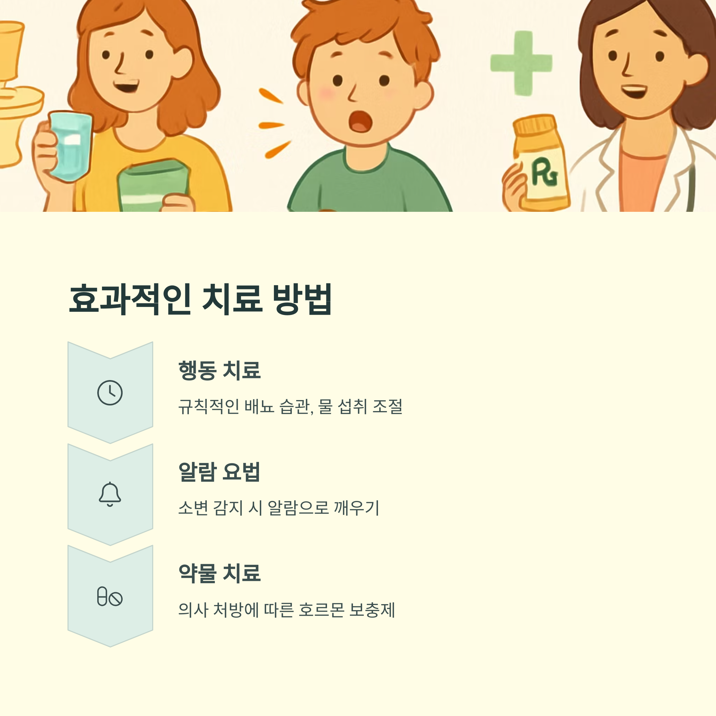 약물 치료는 항이뇨호르몬 부족을 보충하거나 방광 과민성을 줄이는 약을 사용하는 방법인데, 반드시 의사의 처방을 받아야 하며, 장기간 복용은 권장하지 않습니다. 어떤 방법을 선택하든, 아이의 상태와 특성에 맞춰 의사와 상의하여 결정하는 것이 중요해요.